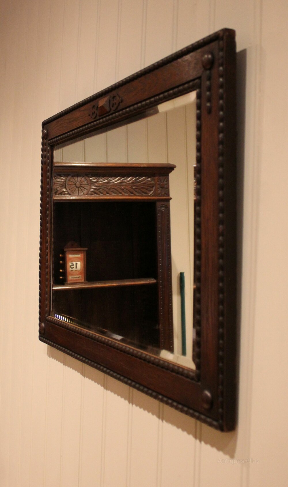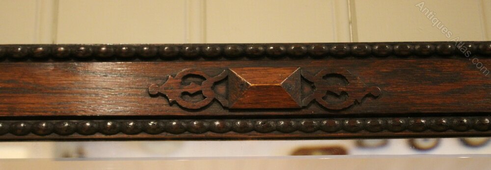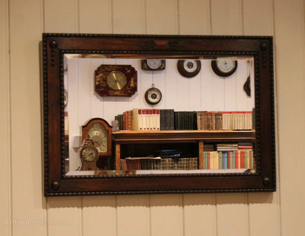Rectangular oak framed wall mirror , having an inset bevel edge mirror with a solid oak frame with applied carved decoration .Height