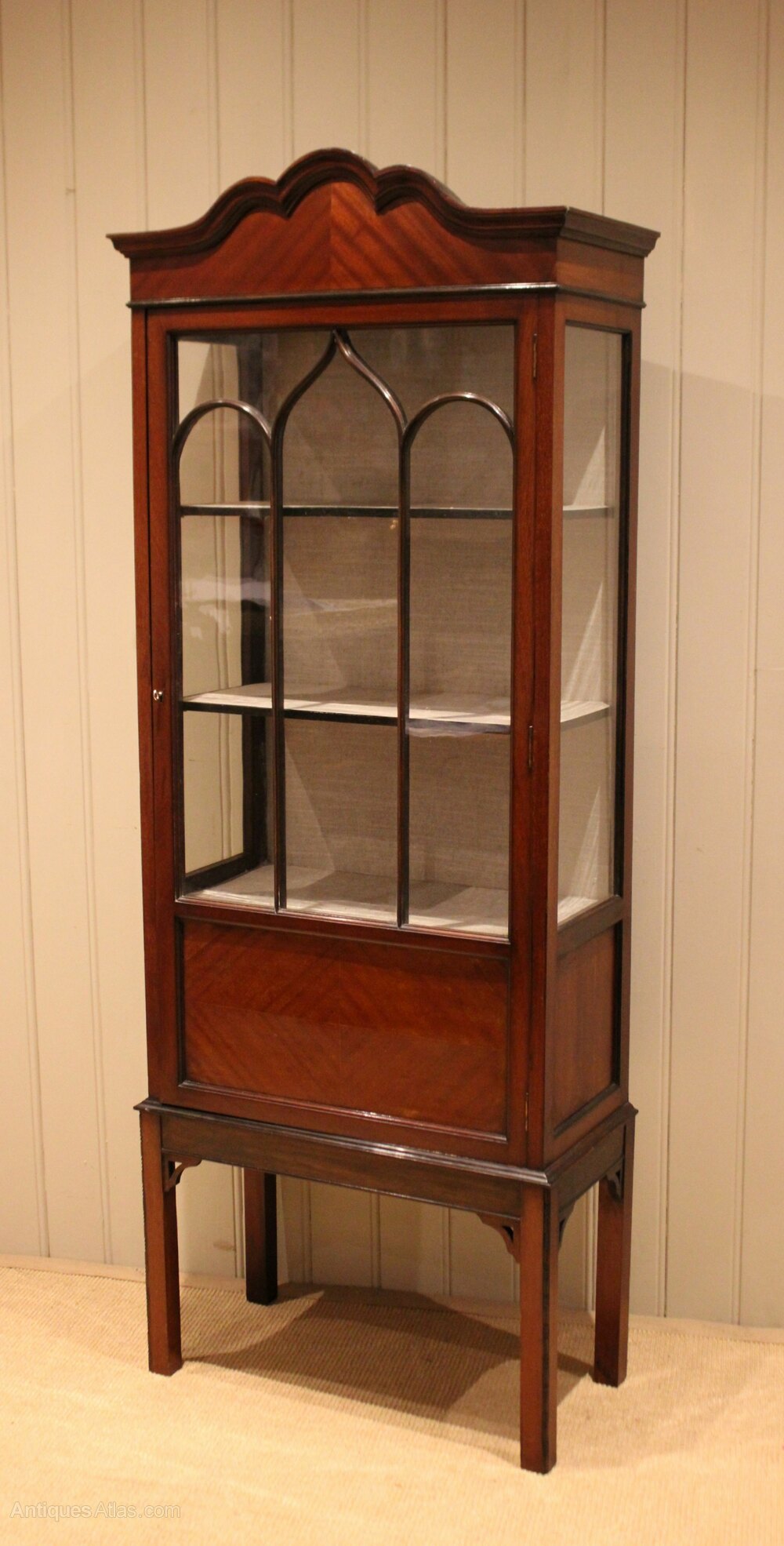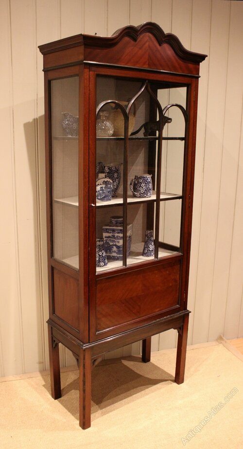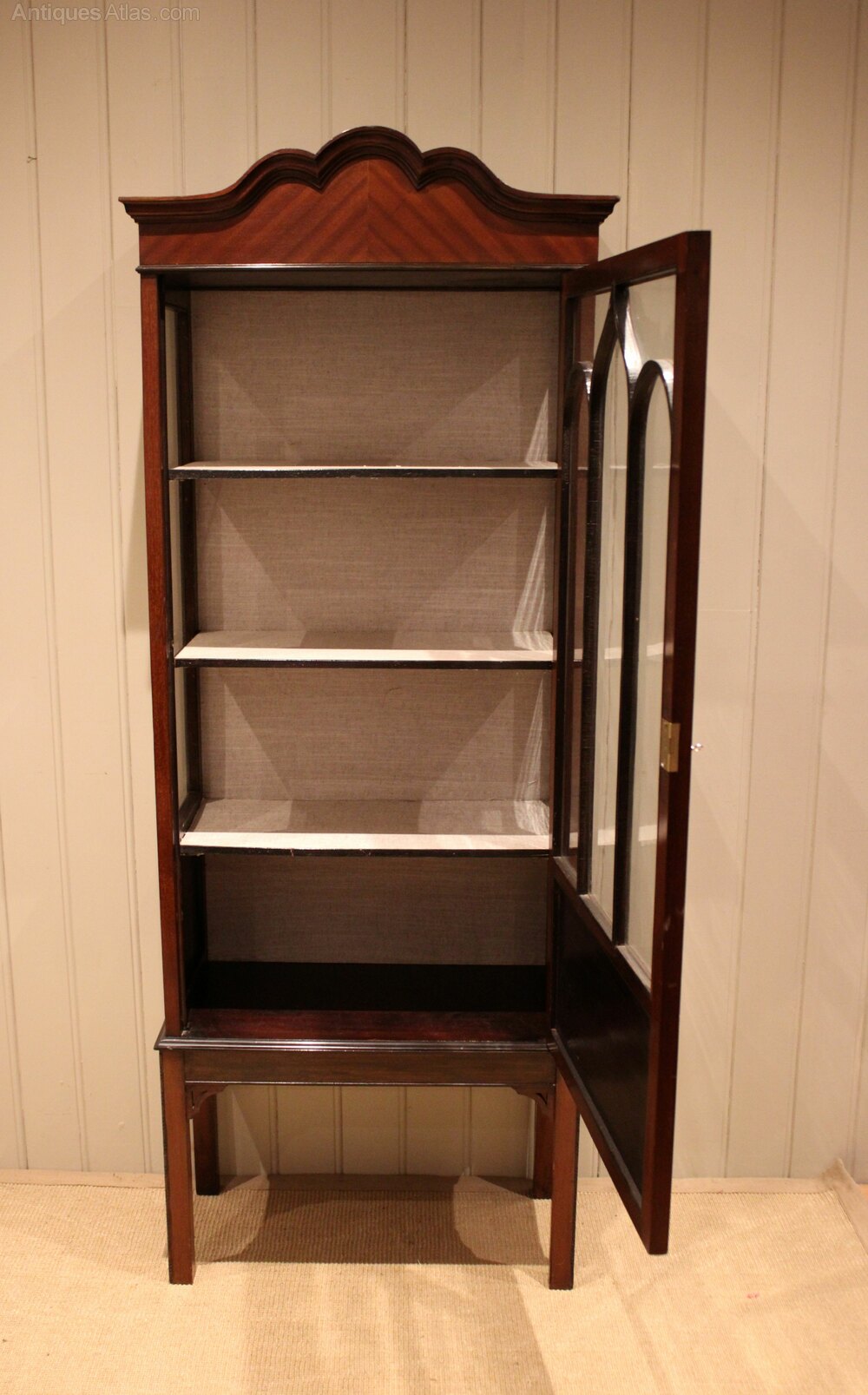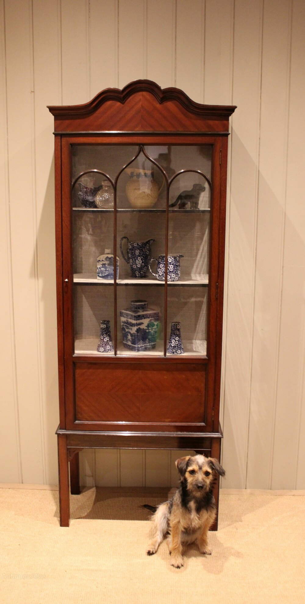 Edwardian mahogany display cabinet having a shaped top with a single astragal glazed door , with three fixed internal shelves , lined with a beige linen fabric , raised on straight legs with a beaded edge and brackets to each side .Height