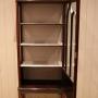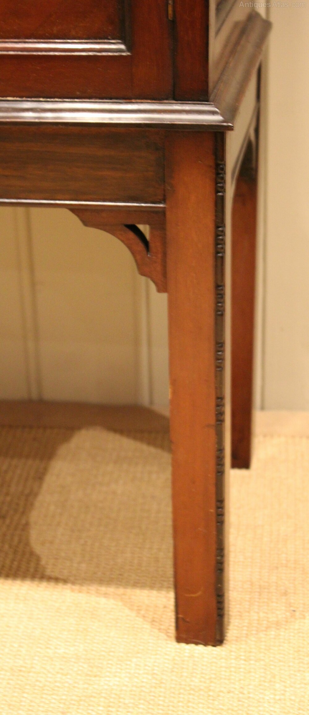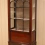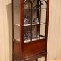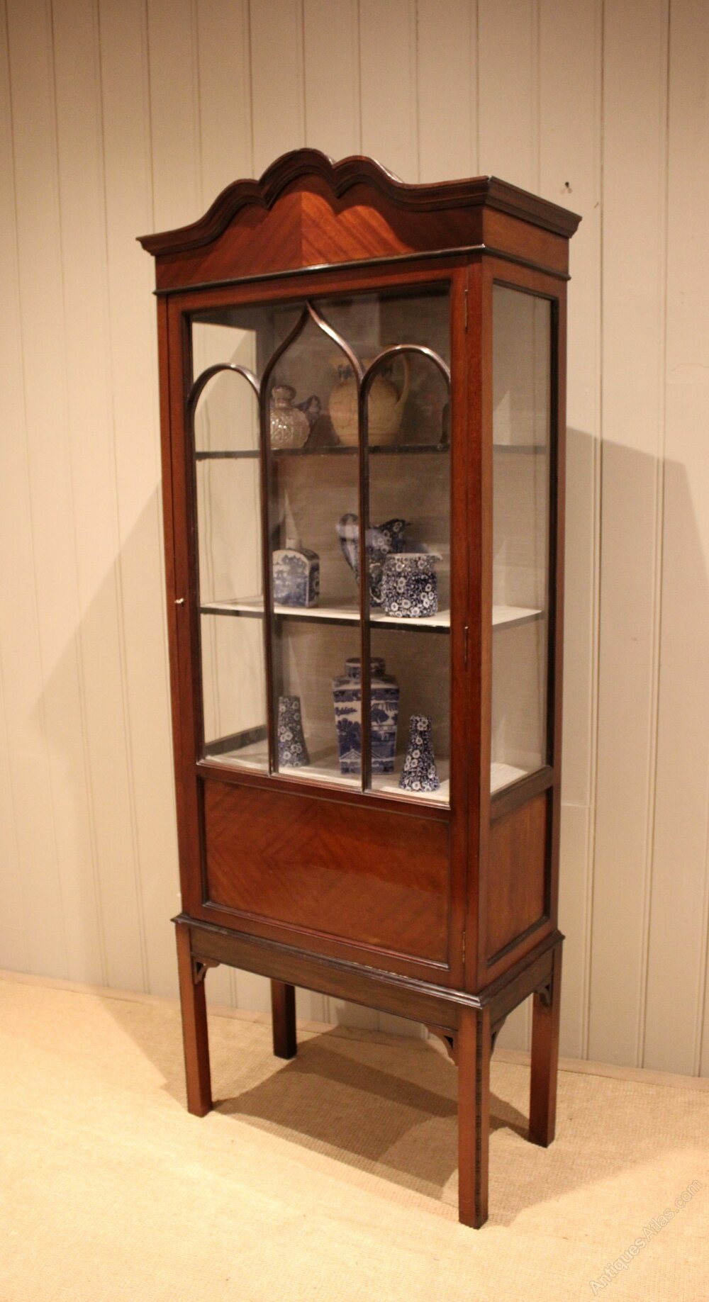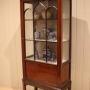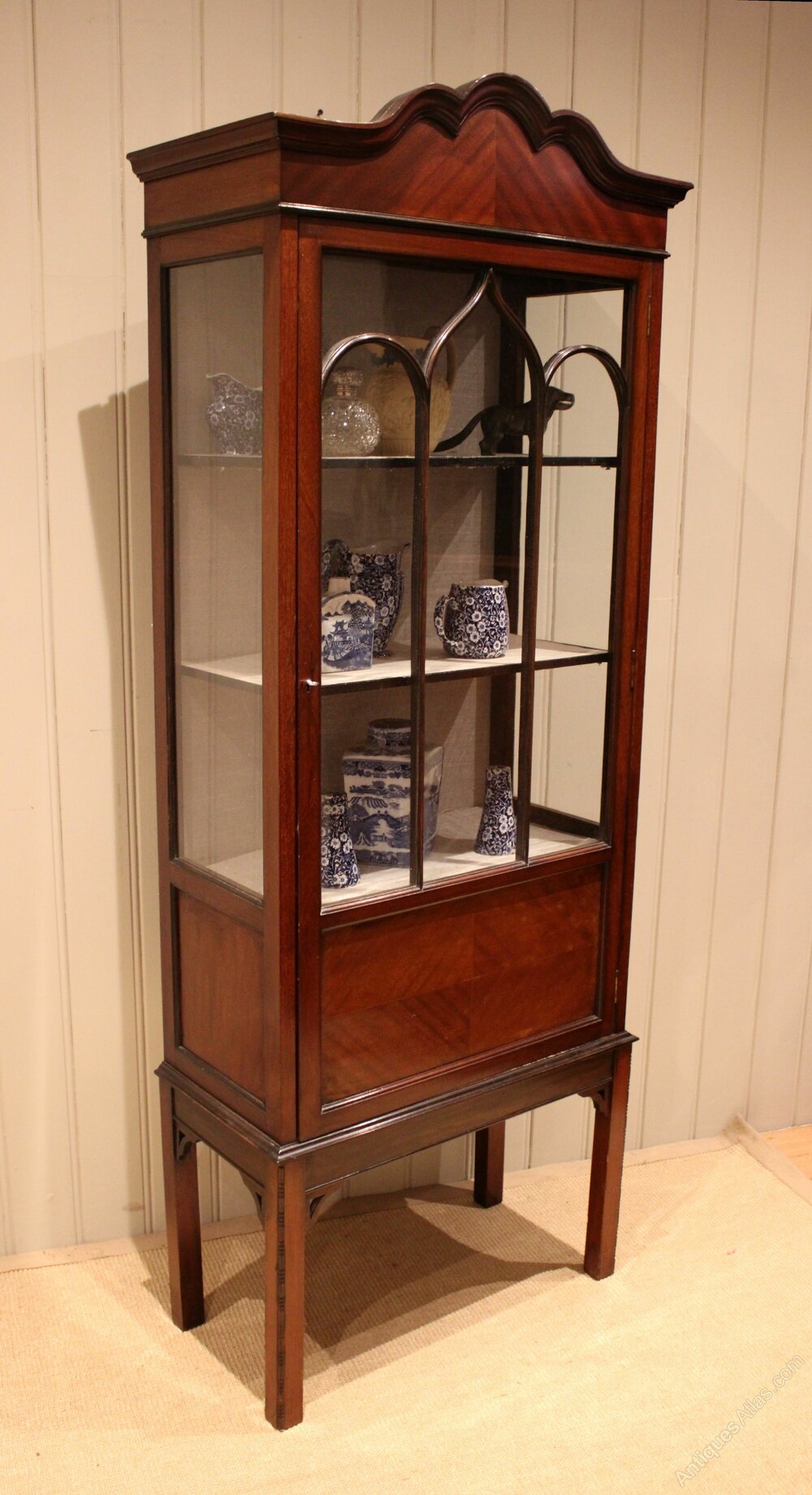 Edwardian mahogany display cabinet having a shaped top with a single astragal glazed door , with three fixed internal shelves , lined with a beige linen fabric , raised on straight legs with a beaded edge and brackets to each side .Height