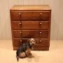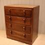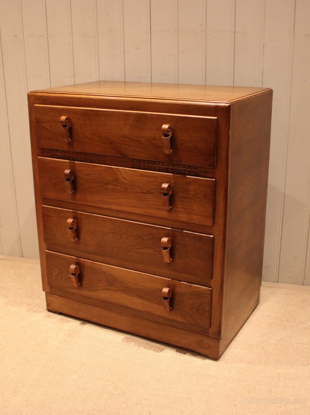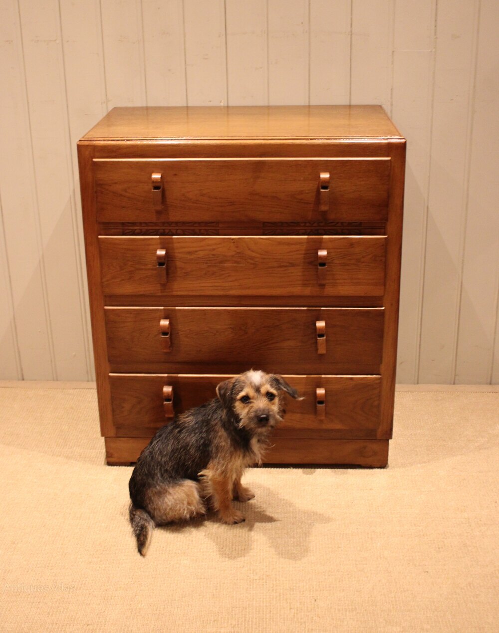 Art Deco oak chest of four drawers having decorative wooden handles , raised on a plinth base . The depth of the drawers is 12.5 cm .Height
