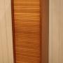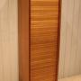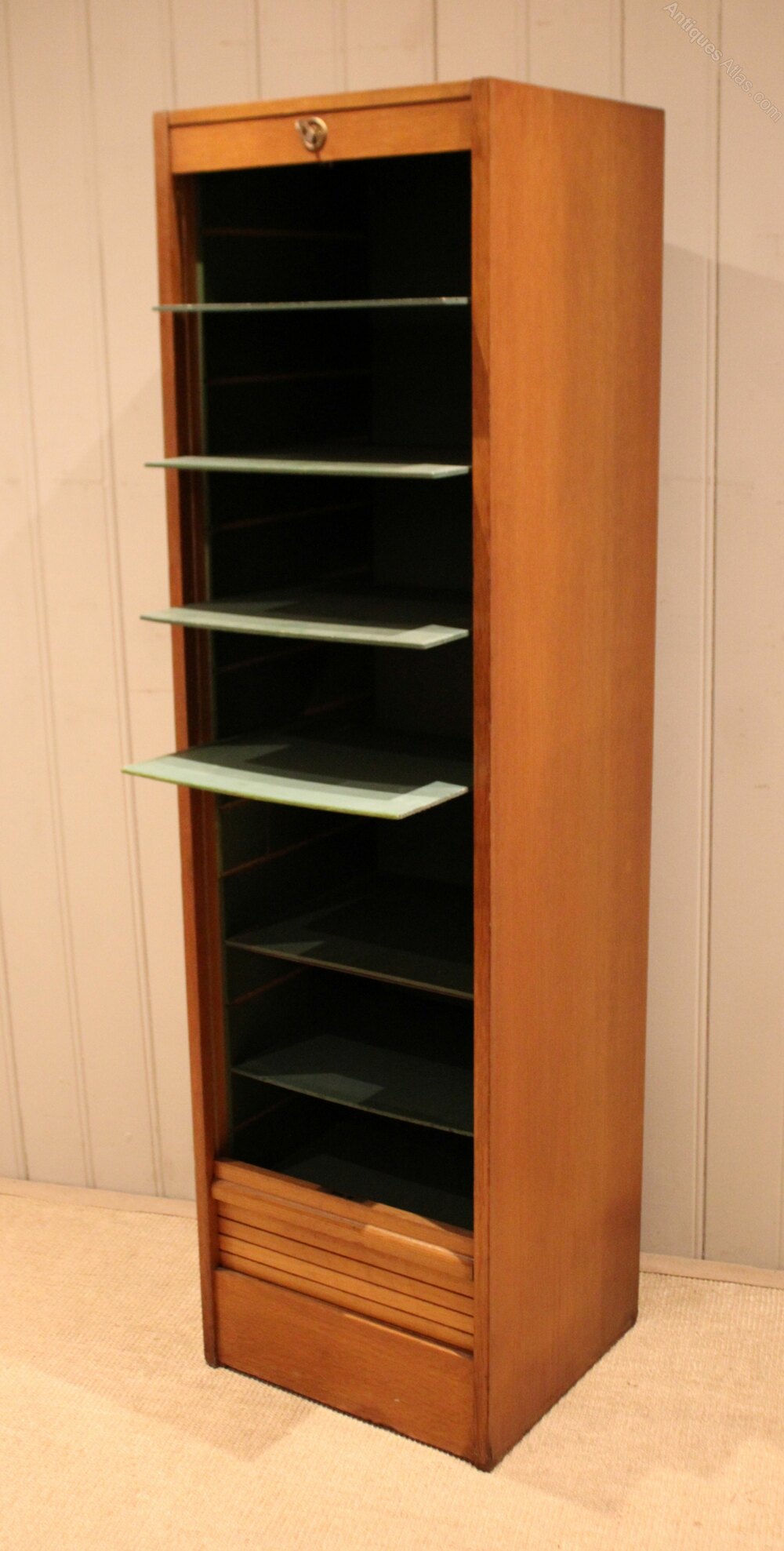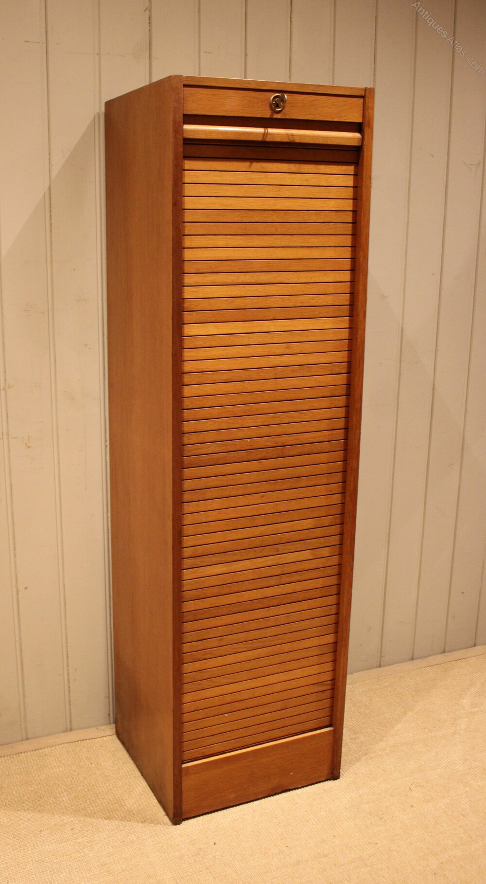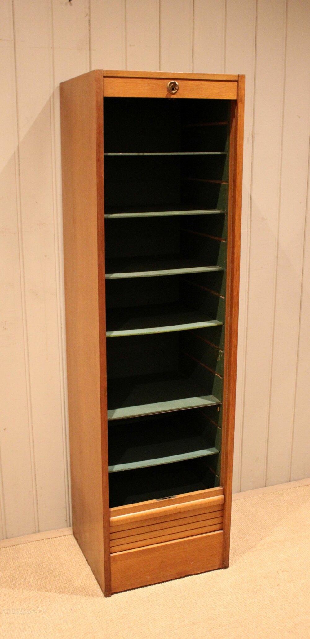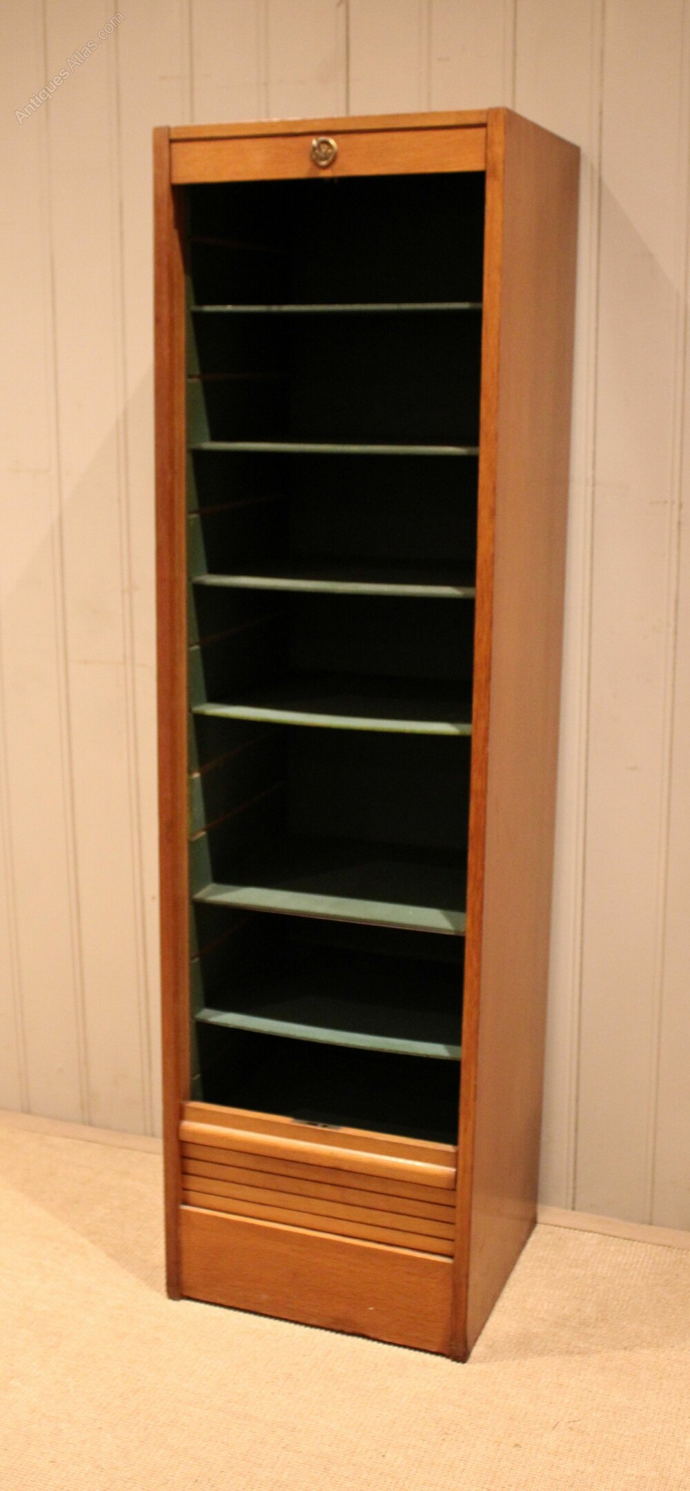 French oak single tambour front filing cabinet having a painted interior with seven slide out plywood shelves , complete with working lock & key .Height