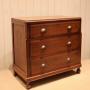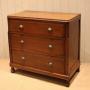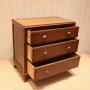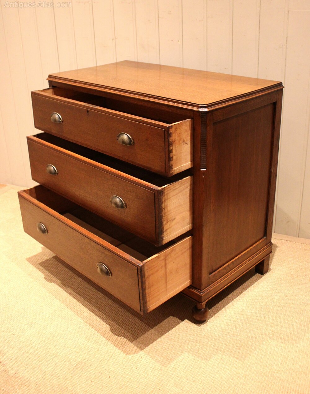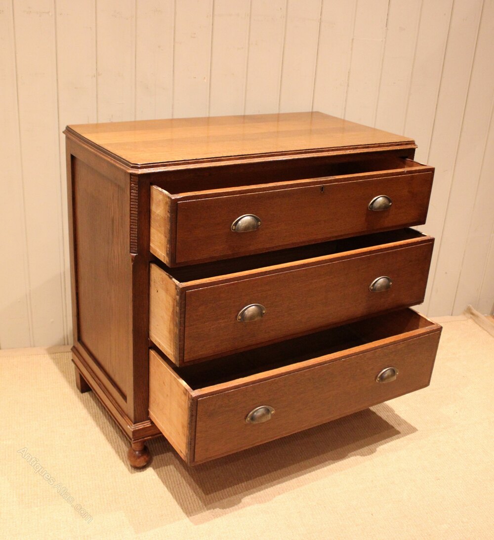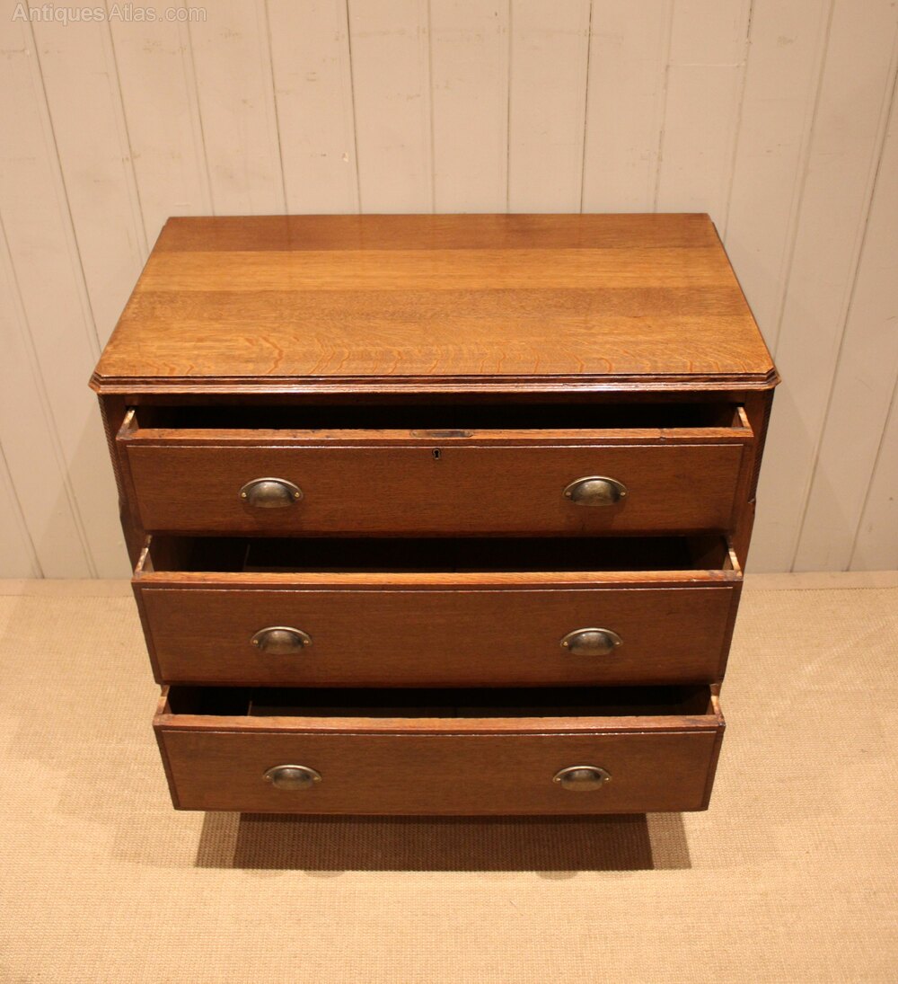 Solid oak low chest of three graduated drawers having brass cup handles , raised on front bun feet . The drawer depths from the bottom up are 17.5 cm , 16.5 cm and at the top 13.5 cm high .Height