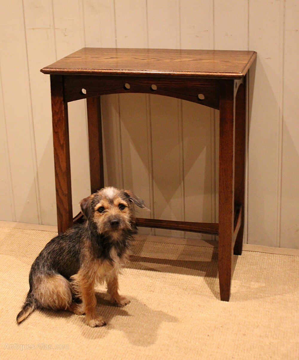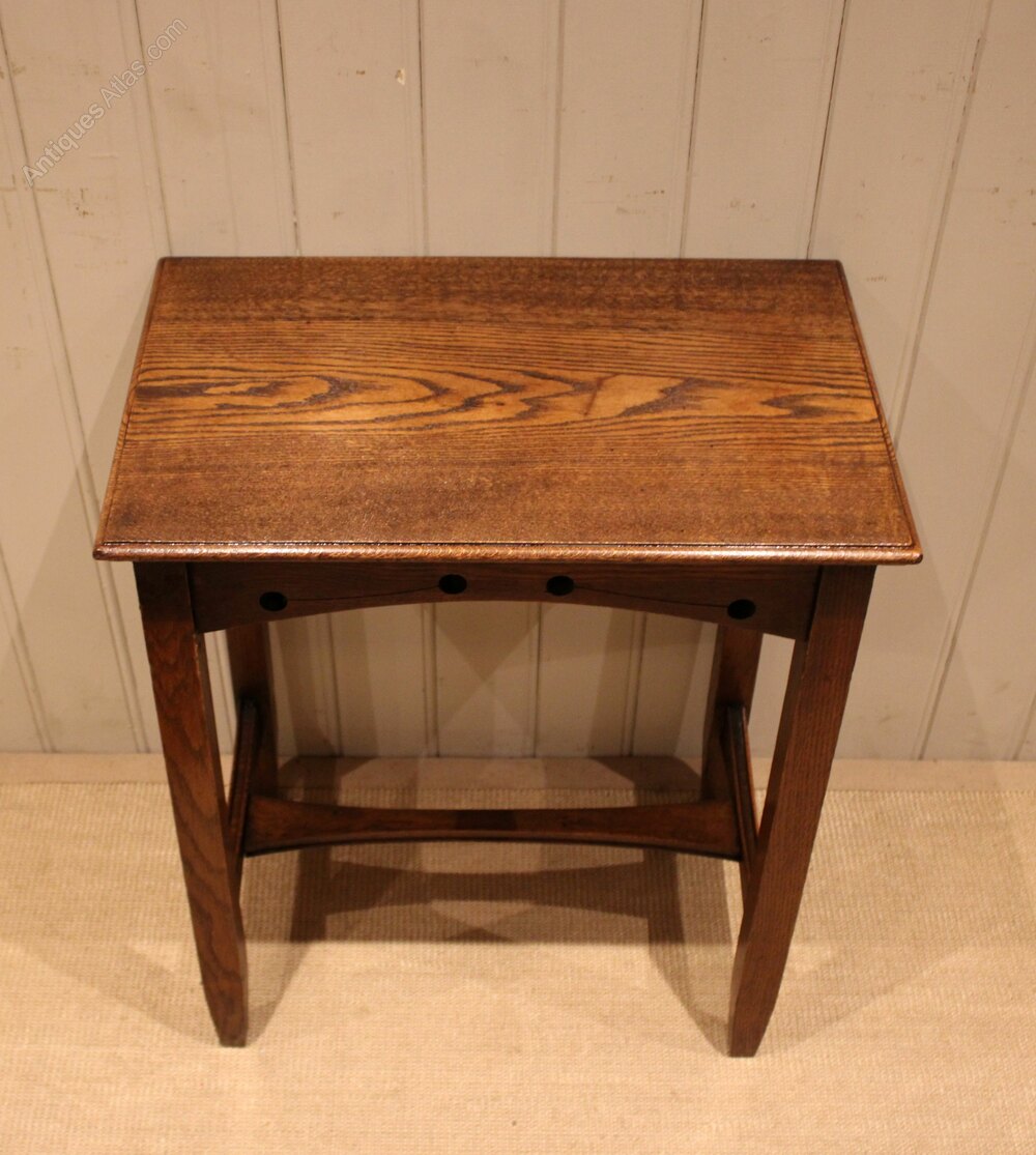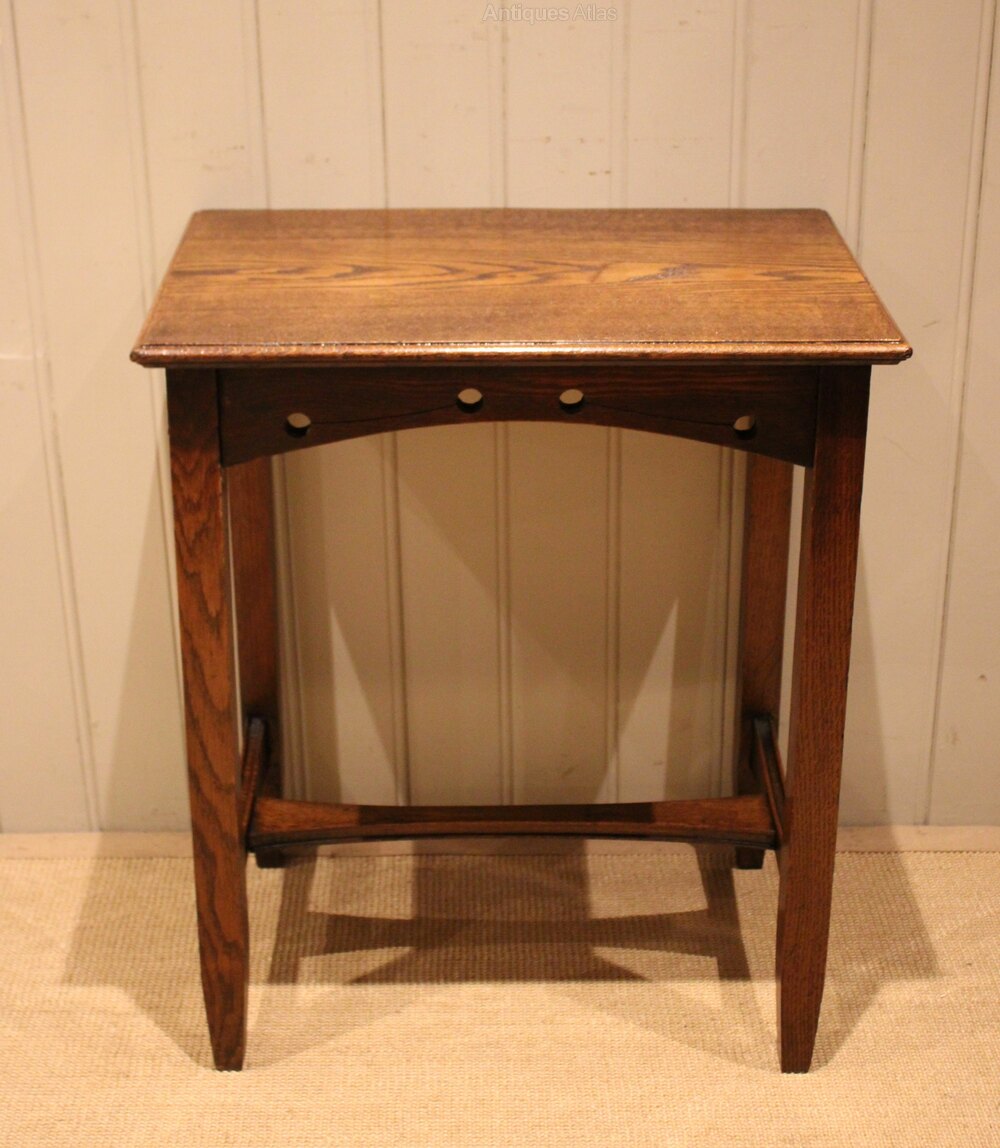 Solid oak Arts & Crafts side table having a pierced apron , raised on straight tapering legs united by a stretcher .Height