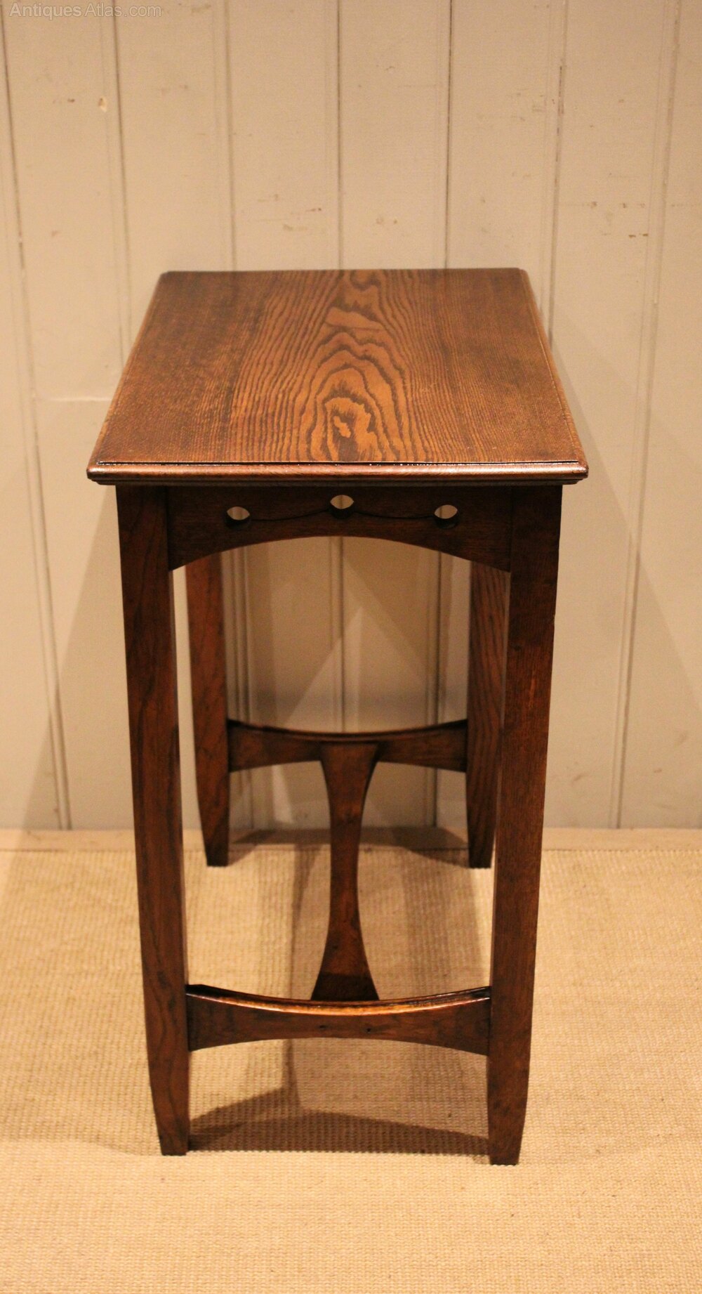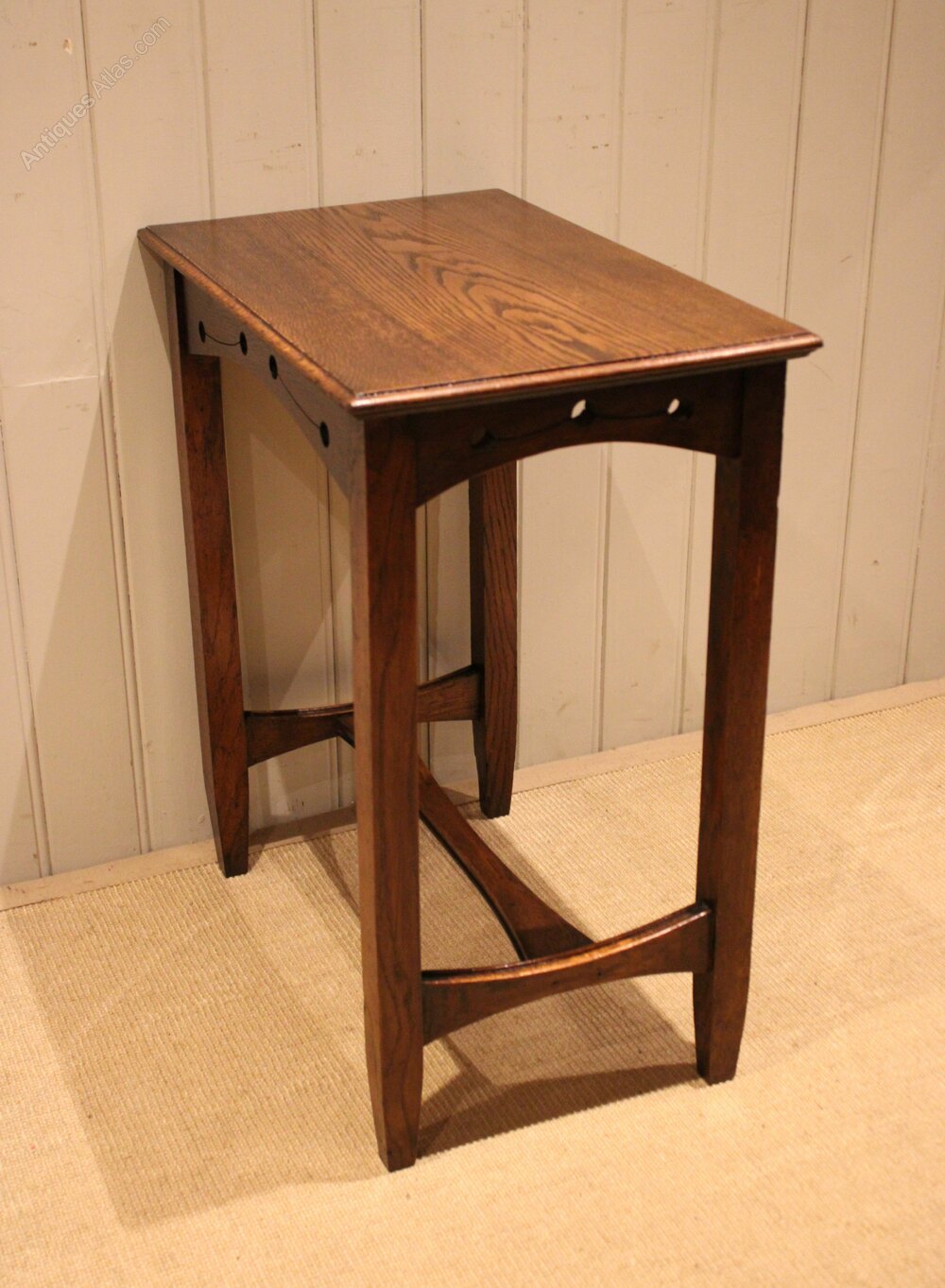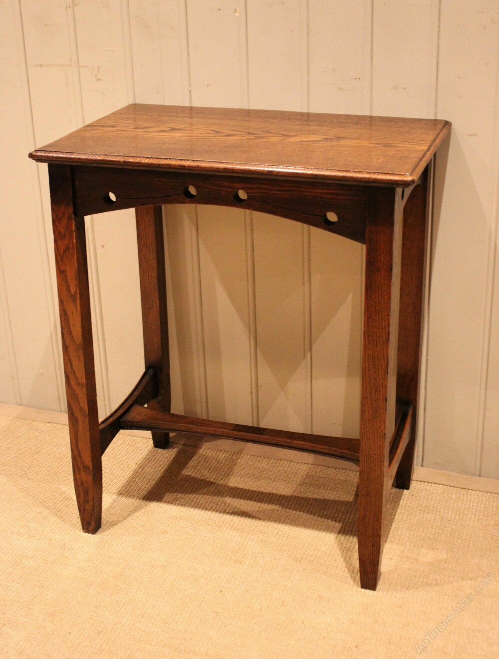 Solid oak Arts & Crafts side table having a pierced apron , raised on straight tapering legs united by a stretcher .Height
