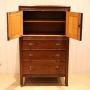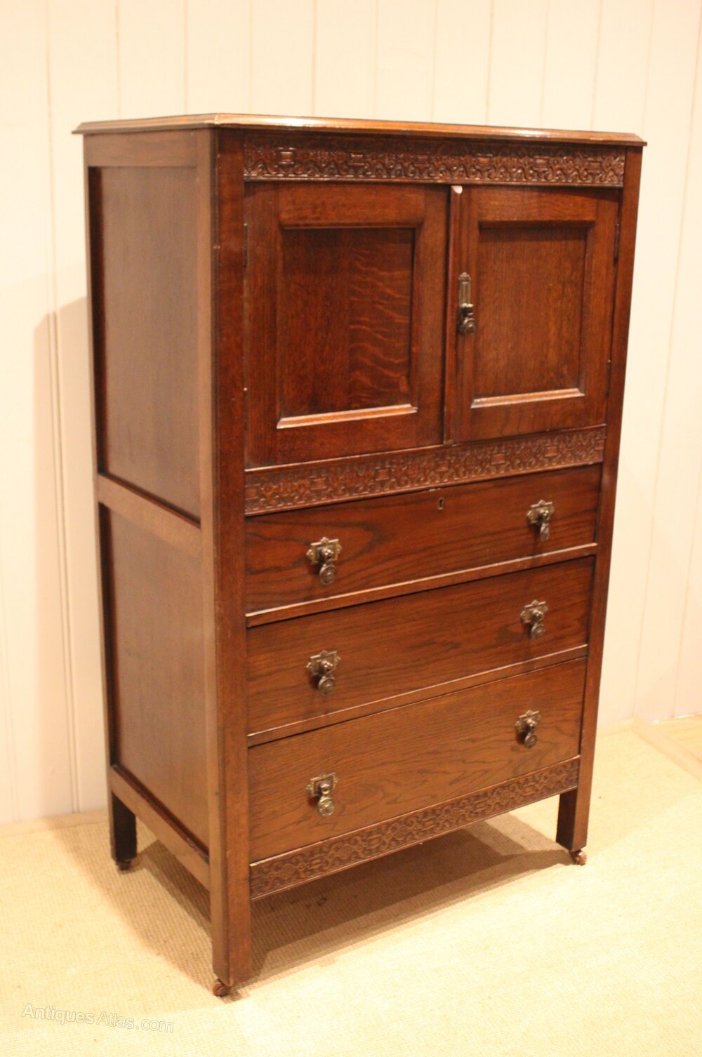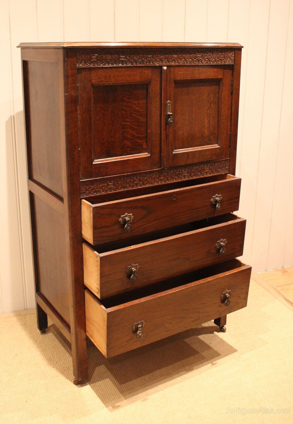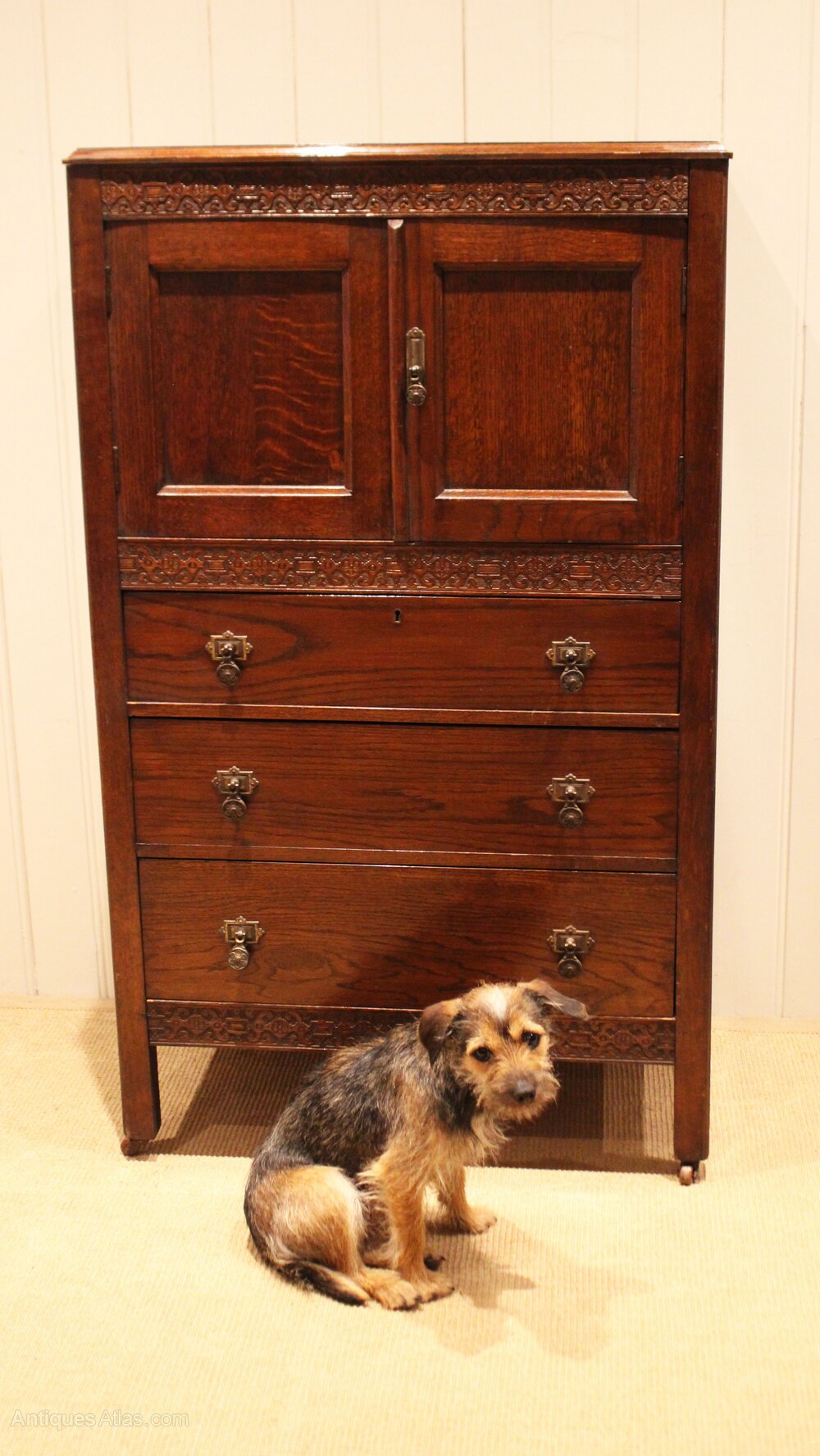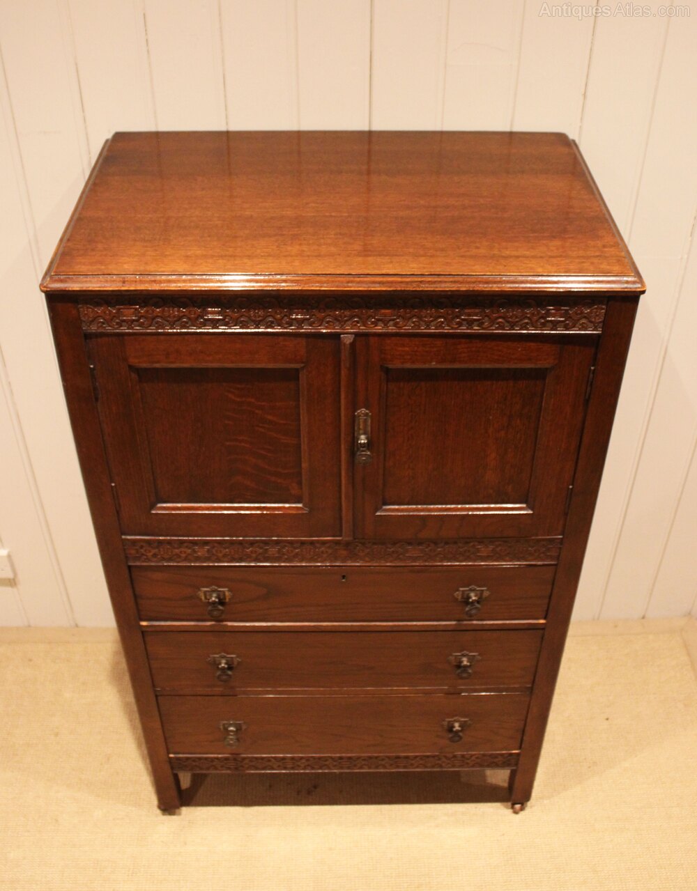 Oak dressing chest having a small cupboard to the top with an internal shelf , above three graduated drawers , raised on short tapering supports . The depth of the drawers from the bottom up are 17 cm , 14 cm and 12 cm to the top .Height