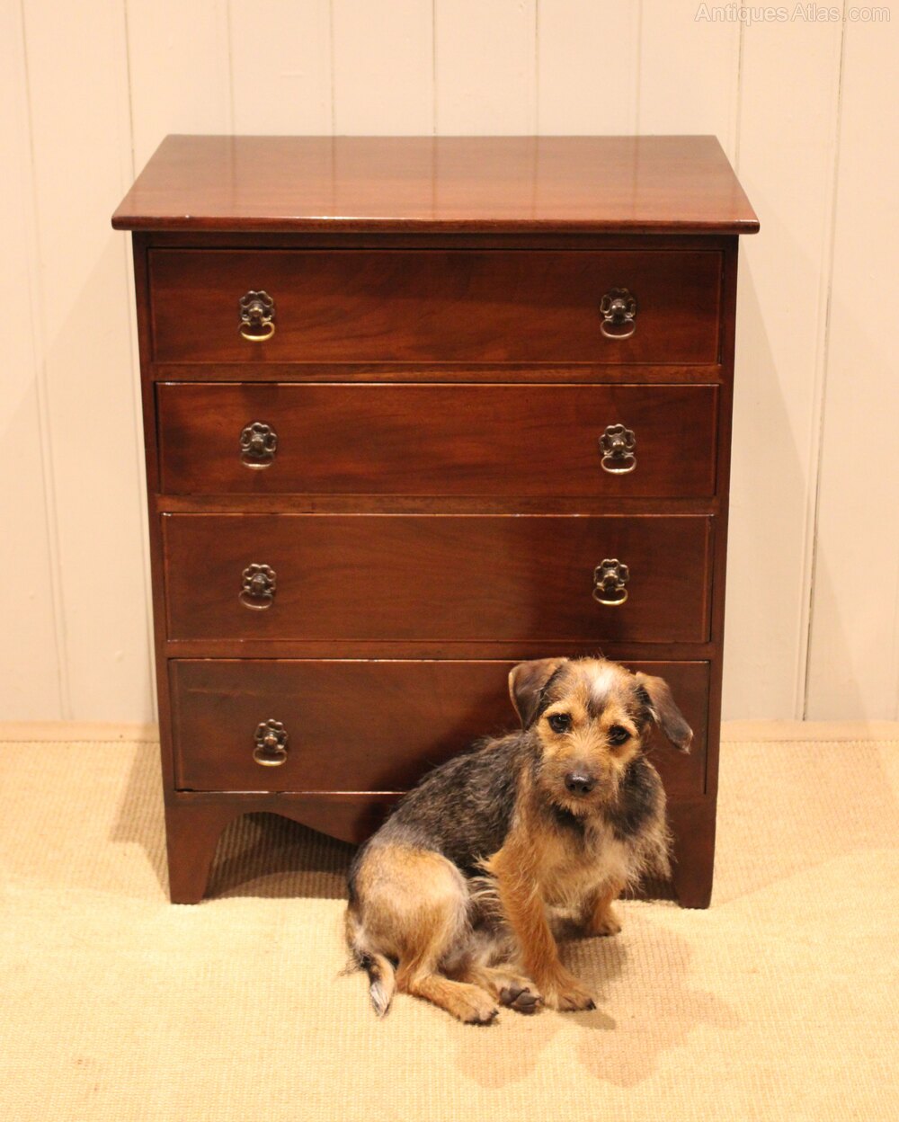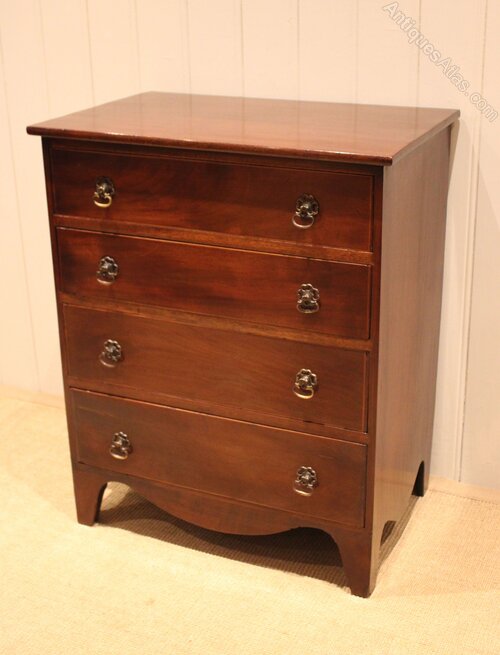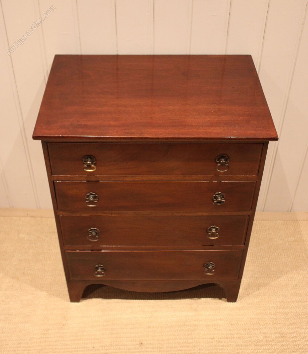 Small proportioned mahogany chest of four long graduated drawers , raised on bracket feet . The drawer depths from the bottom up are 13.5 cm , 12.5 cm , 10 cm and at the top 9 cm deep .Height
