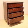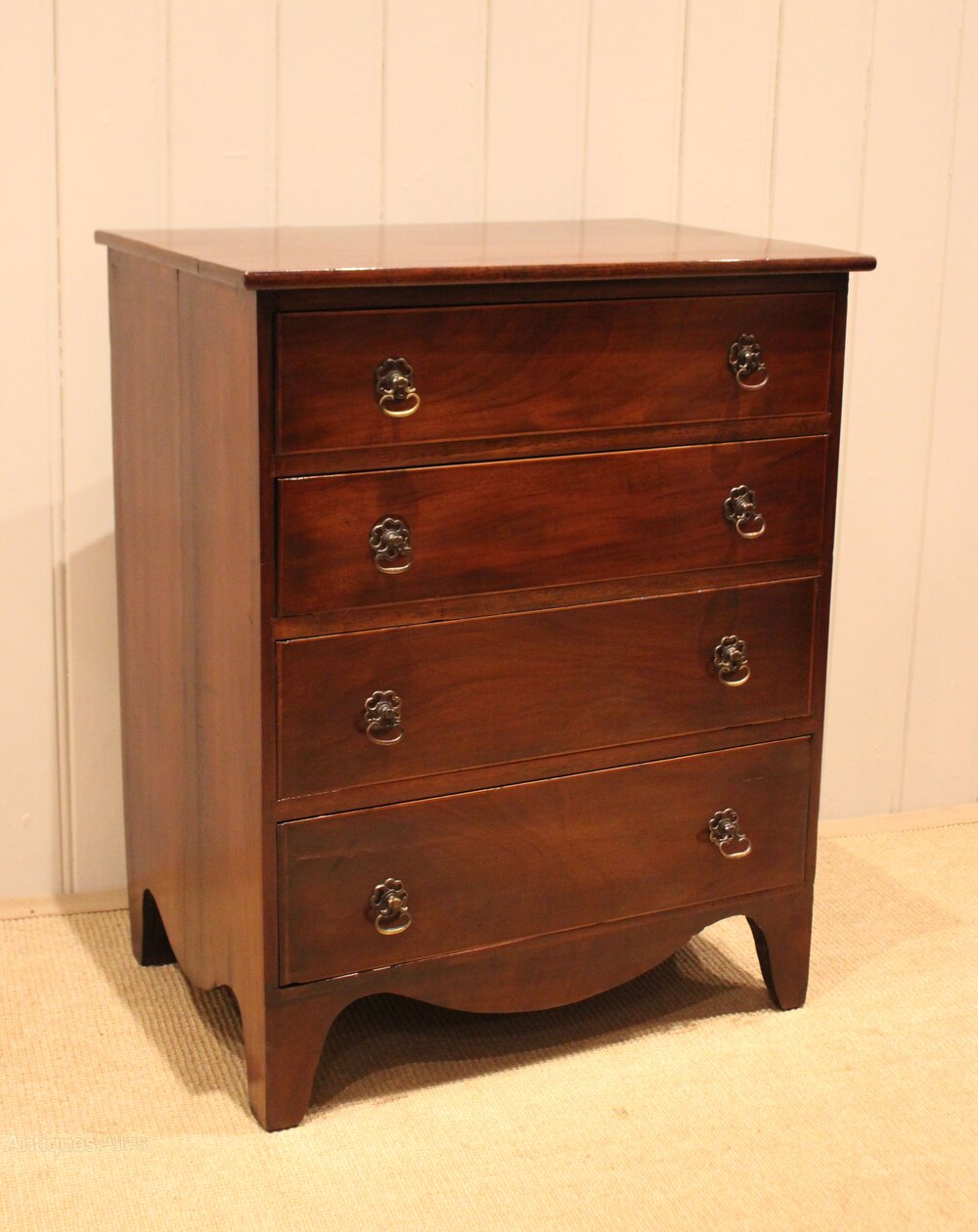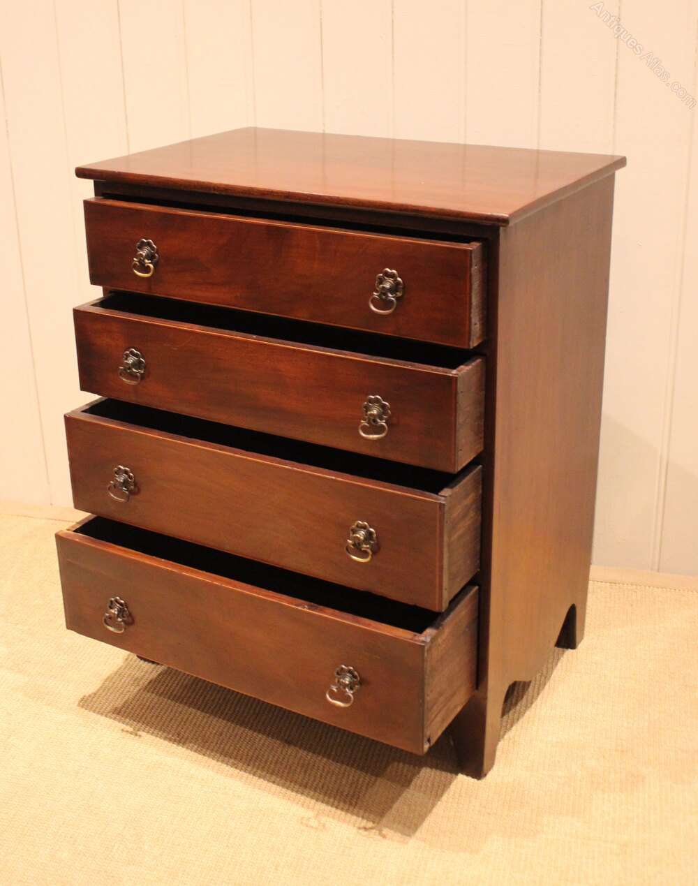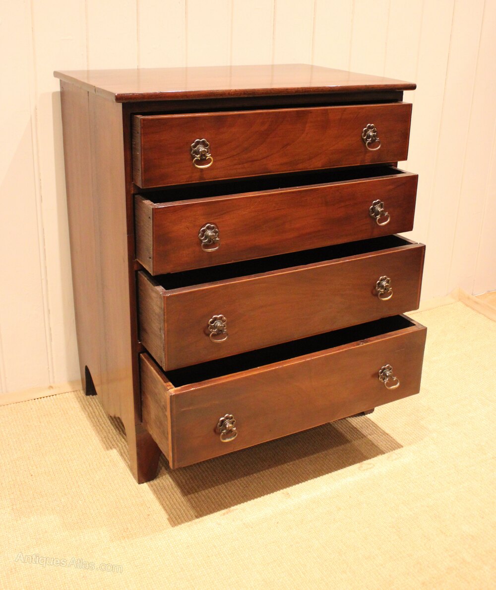 Small proportioned mahogany chest of four long graduated drawers , raised on bracket feet . The drawer depths from the bottom up are 13.5 cm , 12.5 cm , 10 cm and at the top 9 cm deep .Height