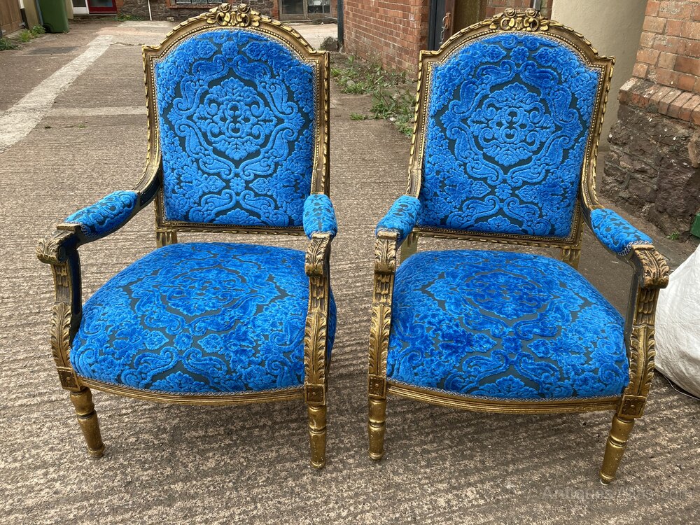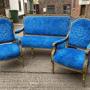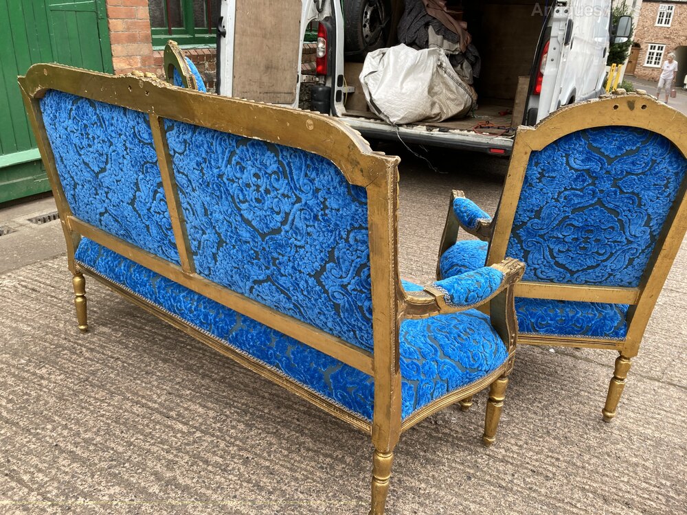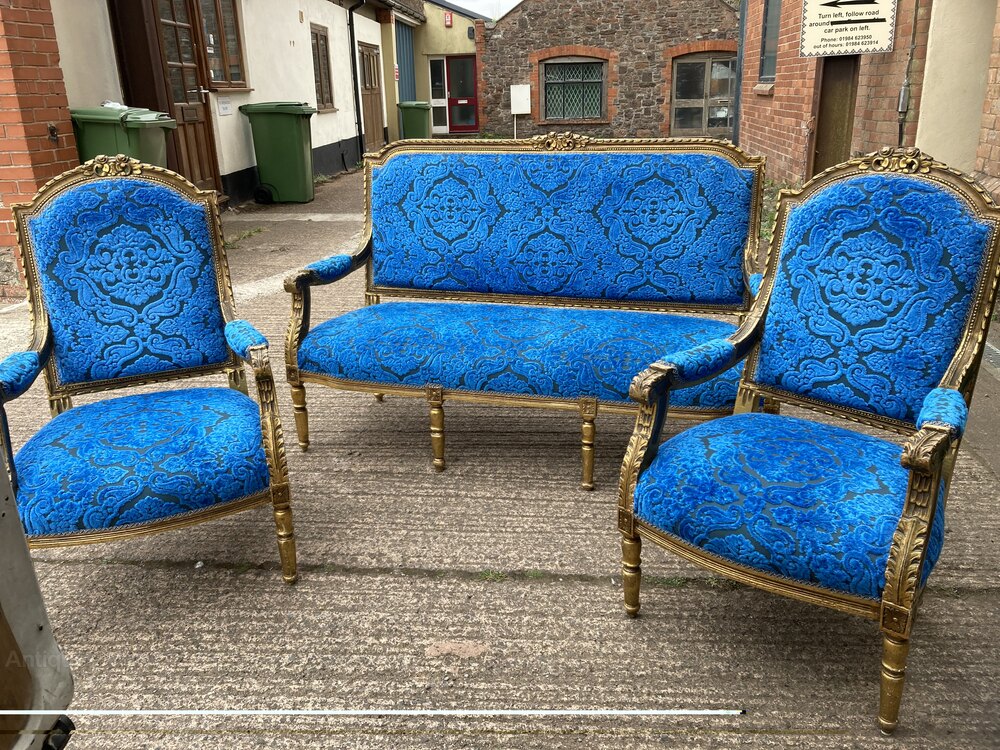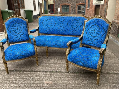 no-21-Late 1800s French Gilt Canape three piece parlour suite in very good condition (seat height 18" sofa 17"chairs )DateEarly 19th Century :