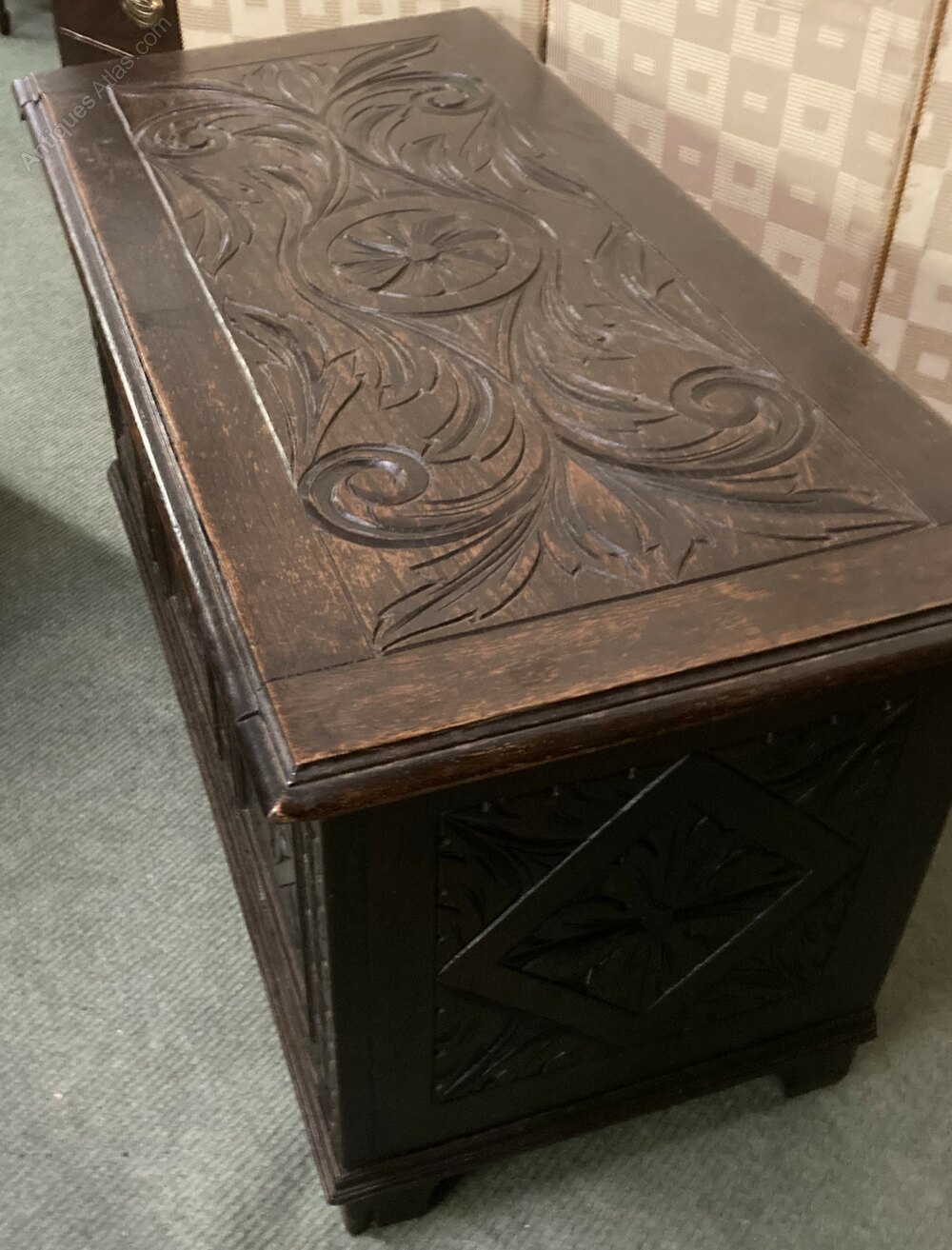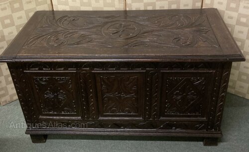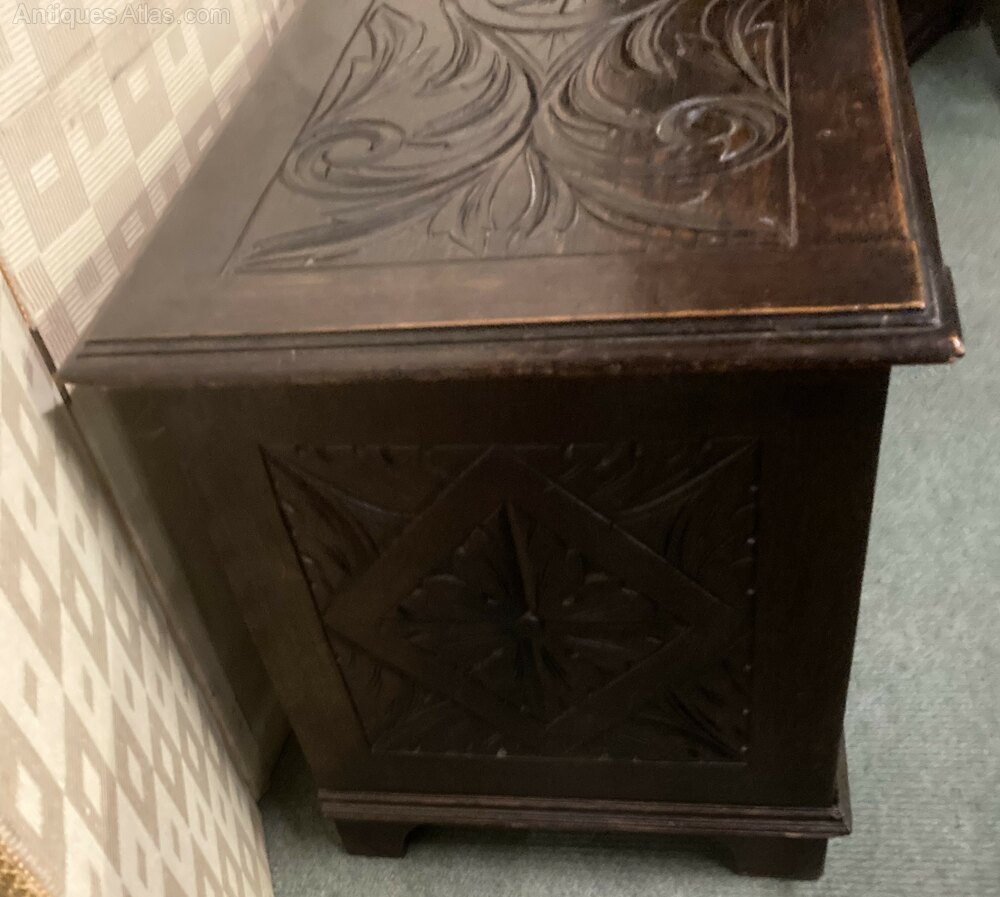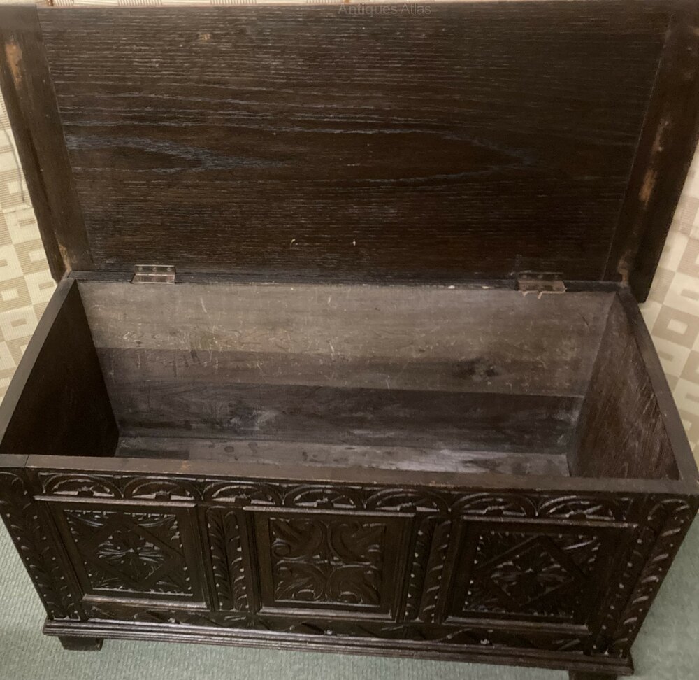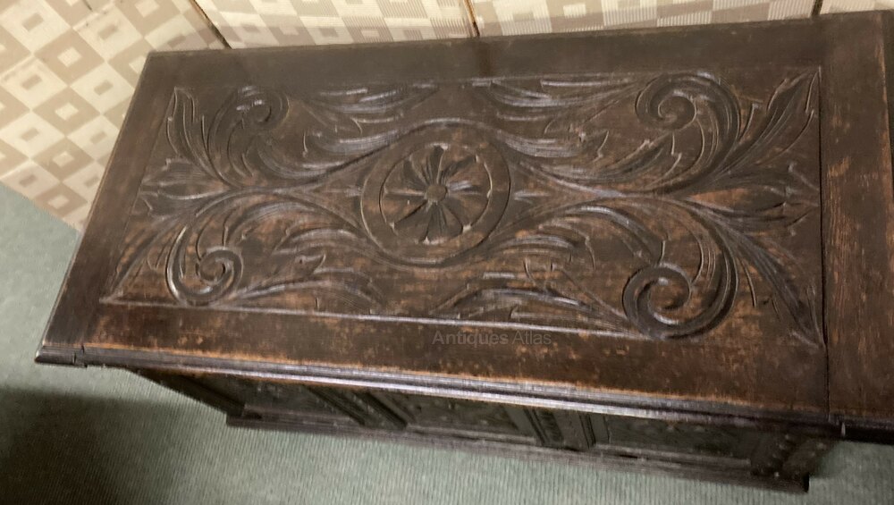 no-262-Small 1800s oak carved coffer in very good conditionDateEarly 19th Century :