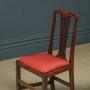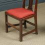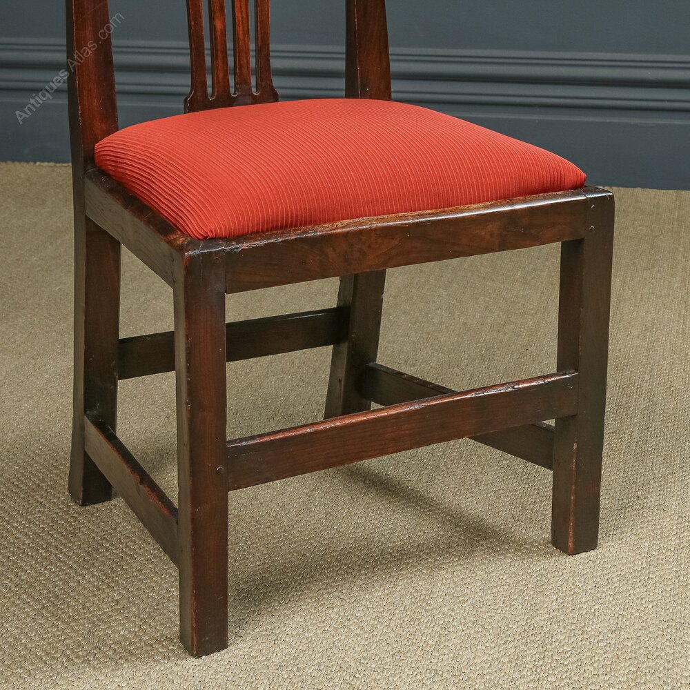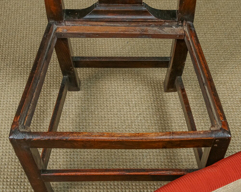 This is a fine quality matched pair of Georgian elm dining chairs, circa 1780, of rural provenance, in the style of the Chippendale period, with newly upholstered seats, in good original condition. It’s unusual to see Chippendale style chairs constructed from elm we believe they were designed for a country / rural home rather than a fine townhouse. The chairs are constructed of solid elm and feature a shaped top rail, with simple pierced central fretwork back splats, flanked by vertical rails, featuring a drop-in seat within the seat frame. The seats have been newly upholstered in top quality heavy duty deep chili red ribbed satin upholstery. The seats have been finished with tradition hessian backing to the undersides. Therefore, the seats are in excellent and clean condition, with no marks. The seats are well padded and firm but comfortable at the same time – you do not sink into the seat. If you do not like the fabric, we will recover the seats in a fabric of your choice (we charge £30 labour per seat). The matched pair of Georgian elm dining chairs feature sabre legs to the rear, united by ‘H’ stretchers for additional strength.
