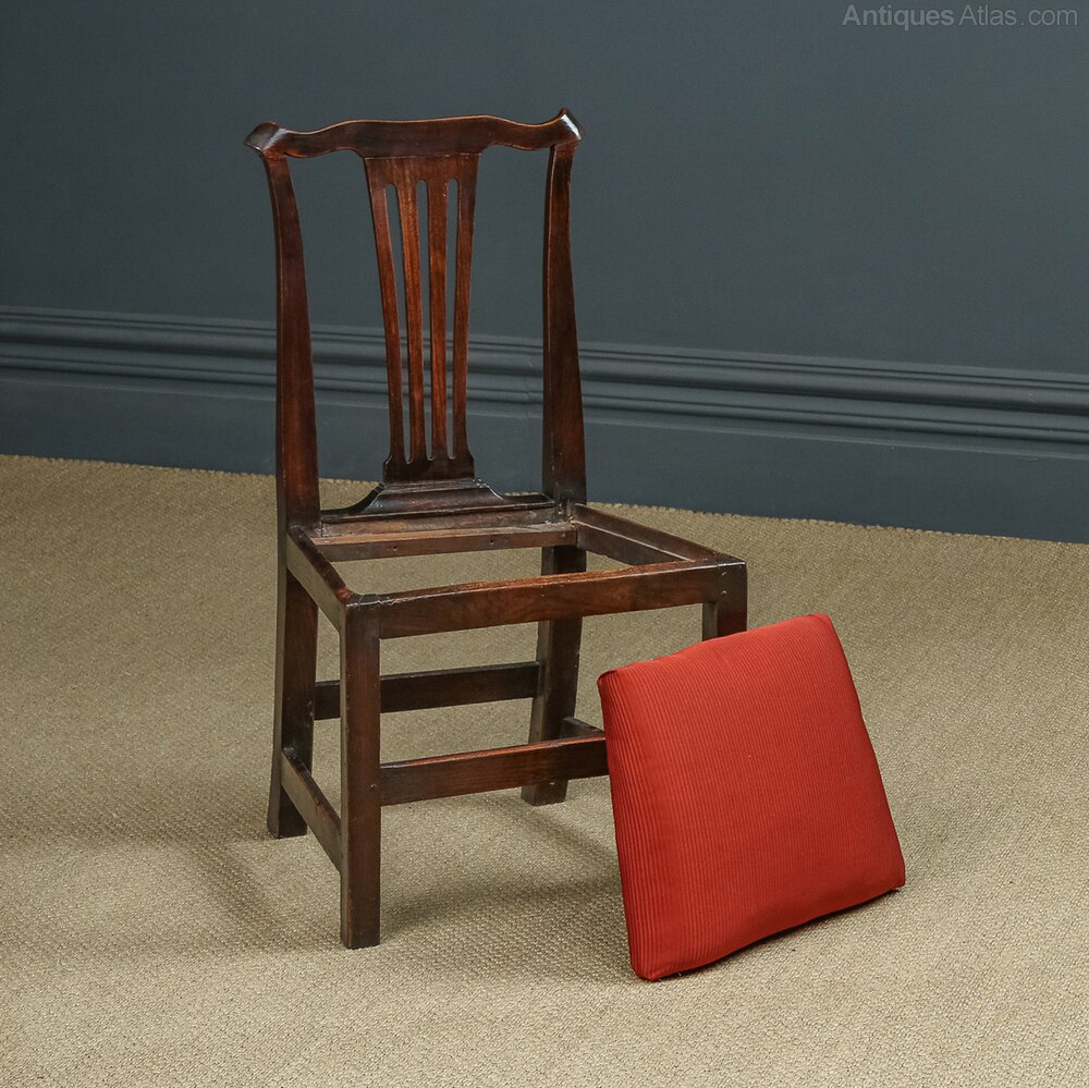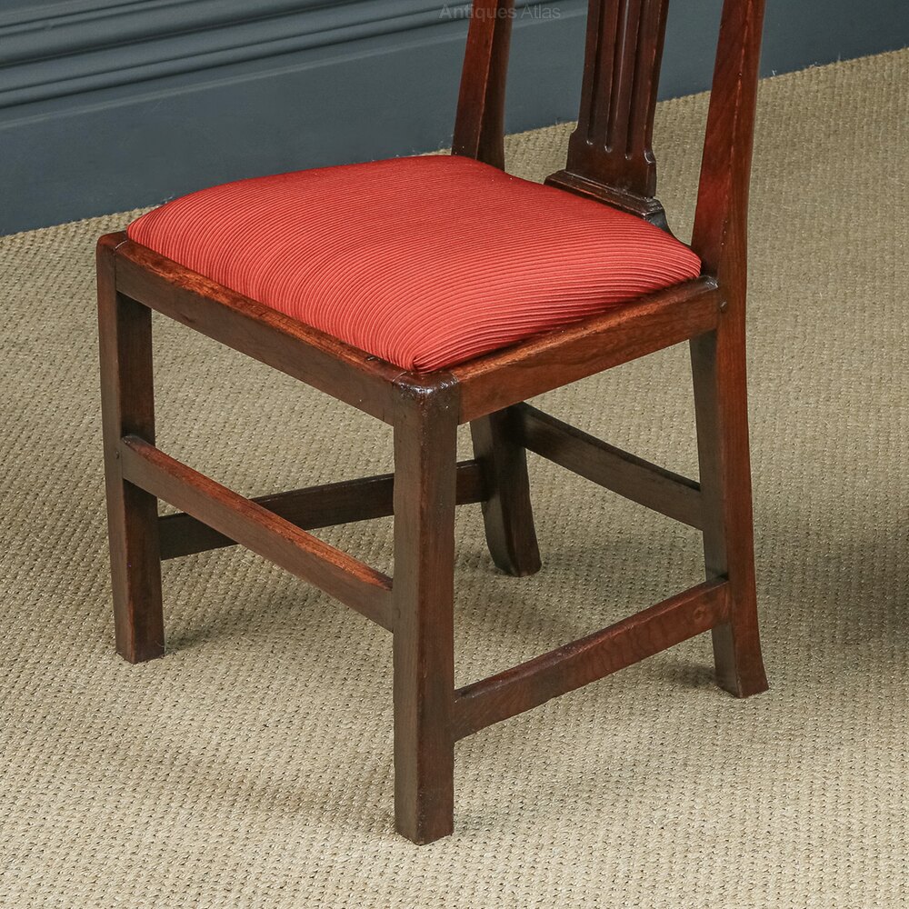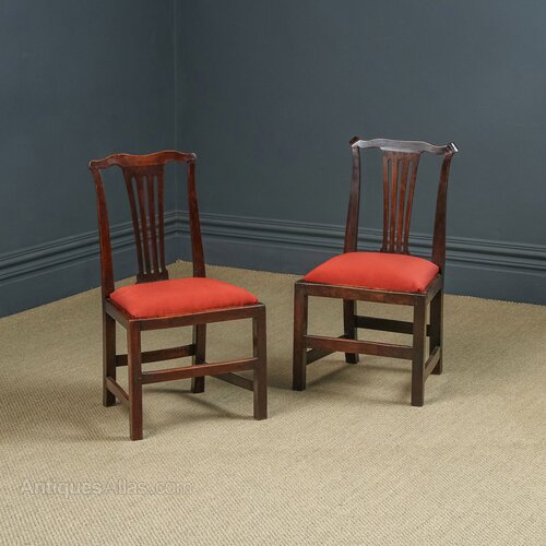 ConditionThis is a fine quality matched pair of Georgian elm dining chairs, circa 1780, of rural provenance, in the style of the Chippendale period, with newly upholstered seats, in good original condition. The chairs have been cleaned and French polished and all loose joints have been glued in our workshop therefore, the chairs are solid in joint. The seats have been finished with tradition hessian backing to the undersides. Therefore, the seats are in excellent and clean condition, with no marks. The seats are well padded and firm but comfortable at the same time – you do not sink into the seat. If you do not like the fabric, we will recover the seats in a fabric of your choice (we charge £30 labour per seat). Evidence of historical woodworm, which has been thoroughly treated for precaution. Please note, it is common for most elm chairs of this age to have signs of historical woodworm, as this was a susceptible timber. As the Georgian dining chairs retain the original polish, the frames boast a lovely original colour and patination that has some variation. They are solid in joint (not loose or wobbly) and are ready to use.