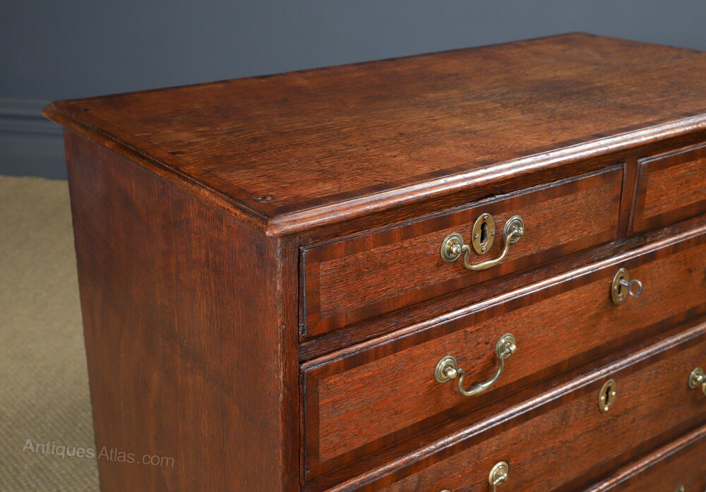 ConditionThis is a fine quality antique English early Georgian walnut chest of drawers, with feather inlay, cross-banding and stunning patination, circa 1730, in excellent condition. Nominal old use marks to the leading edges, frame, sides and drawer bottoms, but nothing significant considering the age of the item. The drawers are constructed with the original hand-dovetail joints and oak drawer linings. The drawer fronts are decorated with good quality later period swan neck brass handles and backplates. The drawers incorporate working steel lever locks with key. The cross-banding and feather inlay is all original and intact. The drawers close flush to the frame. The Georgian chest retains its original cross-banded walnut sides, with original backboards and stands on its original bracket feet. This Georgian chest boasts its original patination, which ensures a stunning colour. This Georgian walnut chest is well constructed, solid in joint and is ready to be used.