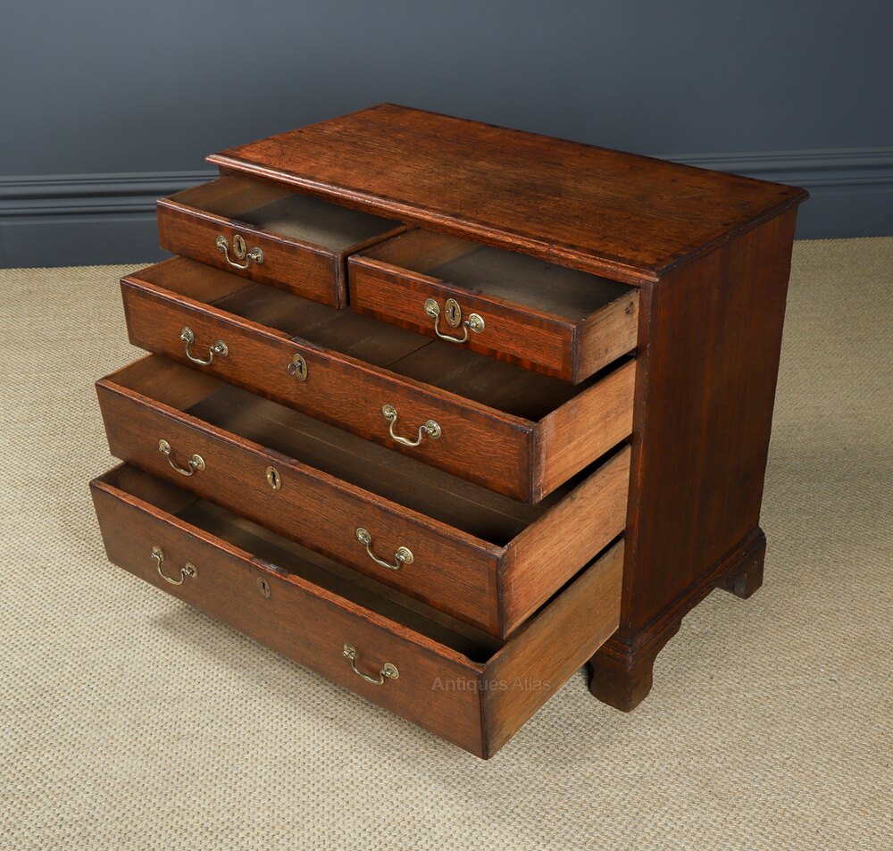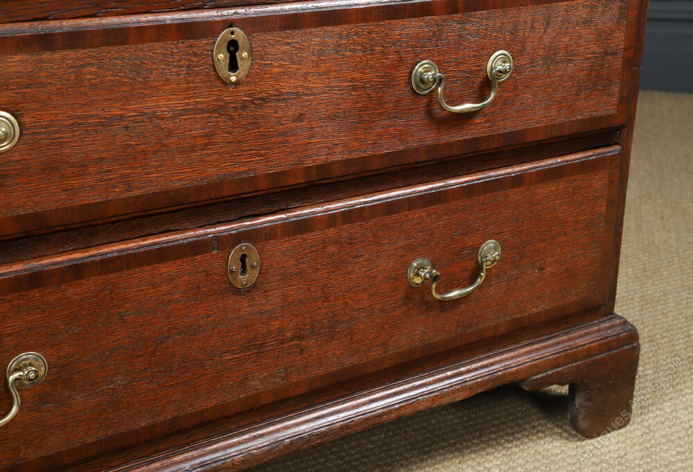 This is a stunning quality antique English Georgian small oak chest of drawers, decorated with mahogany cross-banding, retaining its original handles, circa 1780, in excellent original condition. The small chest of drawers, sometimes known as a “Bachelor chest”, features a two-plank solid oak top, decorated with mahogany cross-banding, above a bank of graduated drawers, with a two-over-three configuration. The drawer fronts are likewise decorated with mahogany cross-banding, to give this Georgian chest of drawers a nice contrast. The moulded drawer fronts retain their original brass swan-neck handles, escutcheons and even their original steel working lever locks and key. It is rare to see chests of drawers of this age, which are in complete original condition. Usually, the brassware has been replaced or the locks removed to be used elsewhere over the centuries. The drawers are constructed with hand-dovetailed joints and also retain their original oak drawer linings. The small oak chest of drawers is raised on a simple moulded base and terminates on its original bracket feet. The sides of the chest are in excellent original condition, with no visible splits or shrinkage to the timbers. Additionally, the backboards and floorboards are original. The Georgian chest of drawers’ frame has been constructed in the traditional manner for its period.