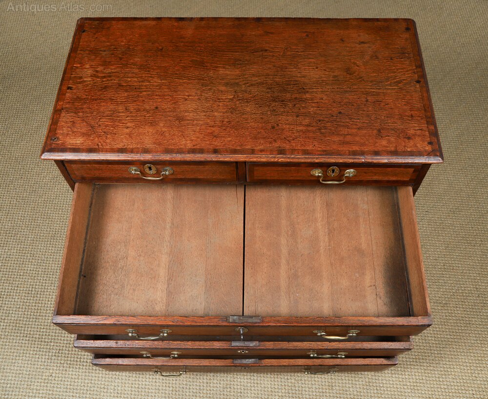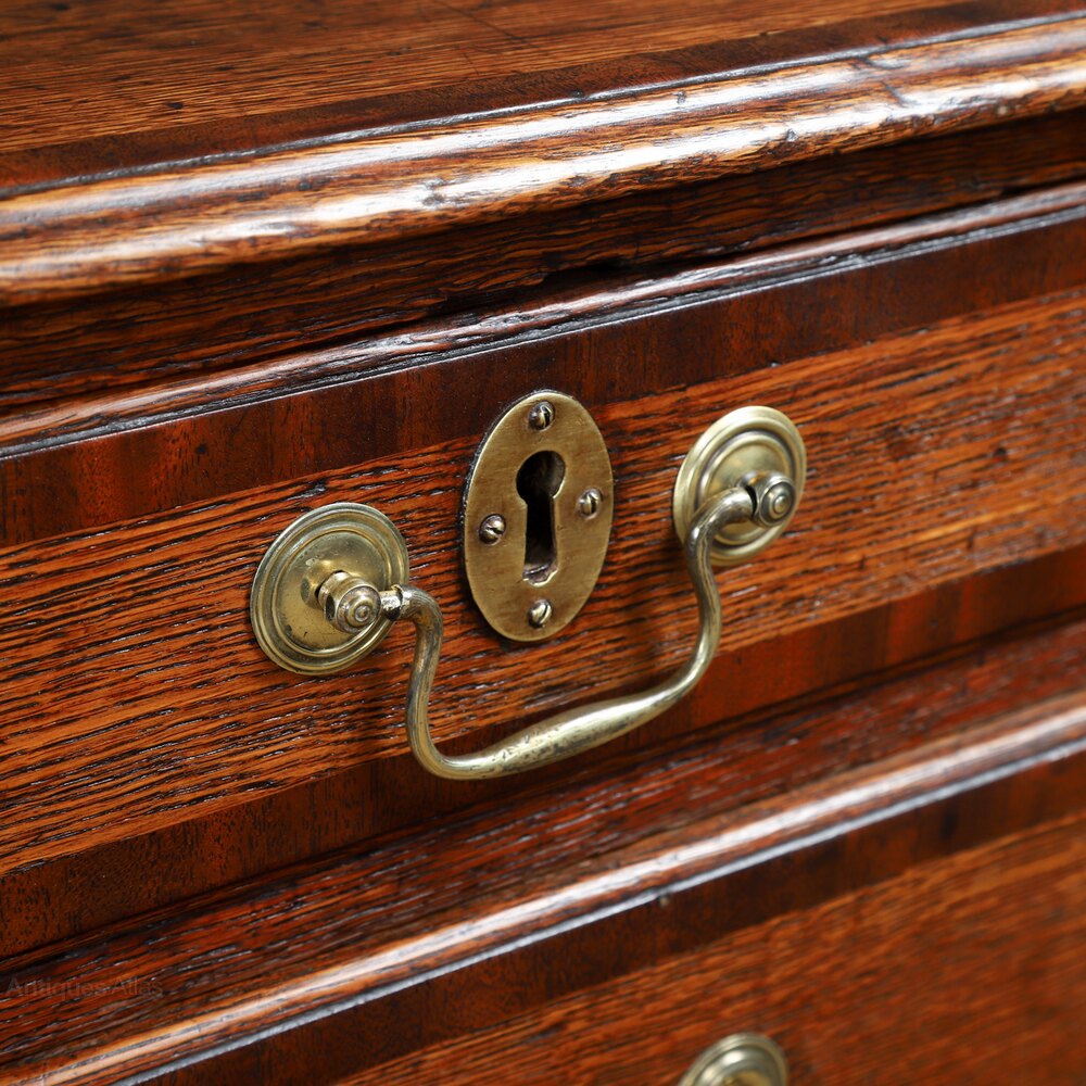 This is a stunning quality antique English Georgian small oak chest of drawers, decorated with mahogany cross-banding, retaining its original handles, circa 1780, in excellent original condition.Summary: