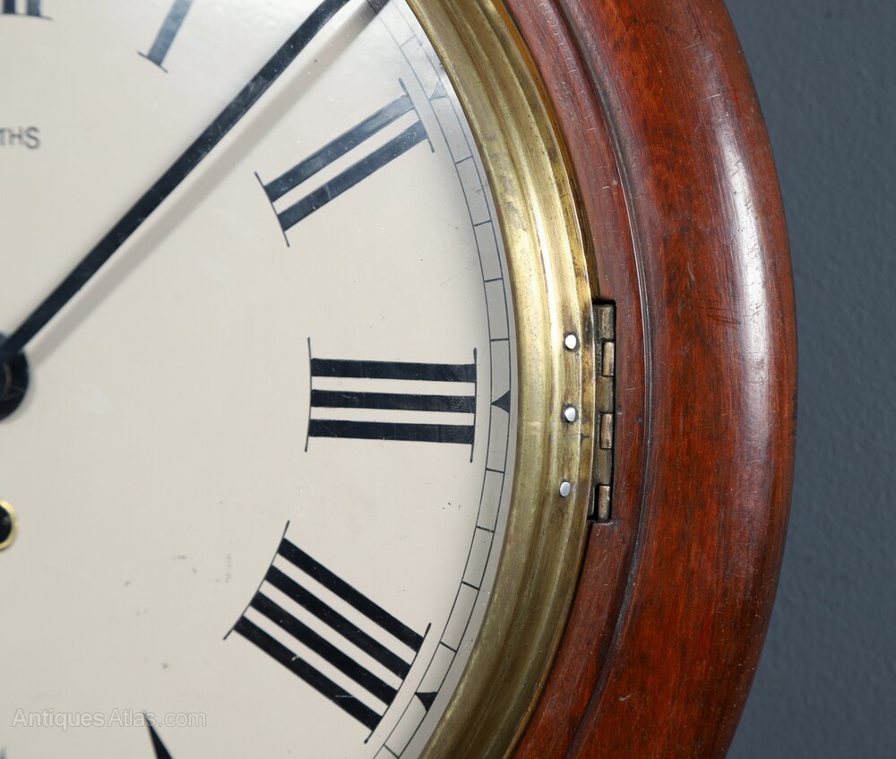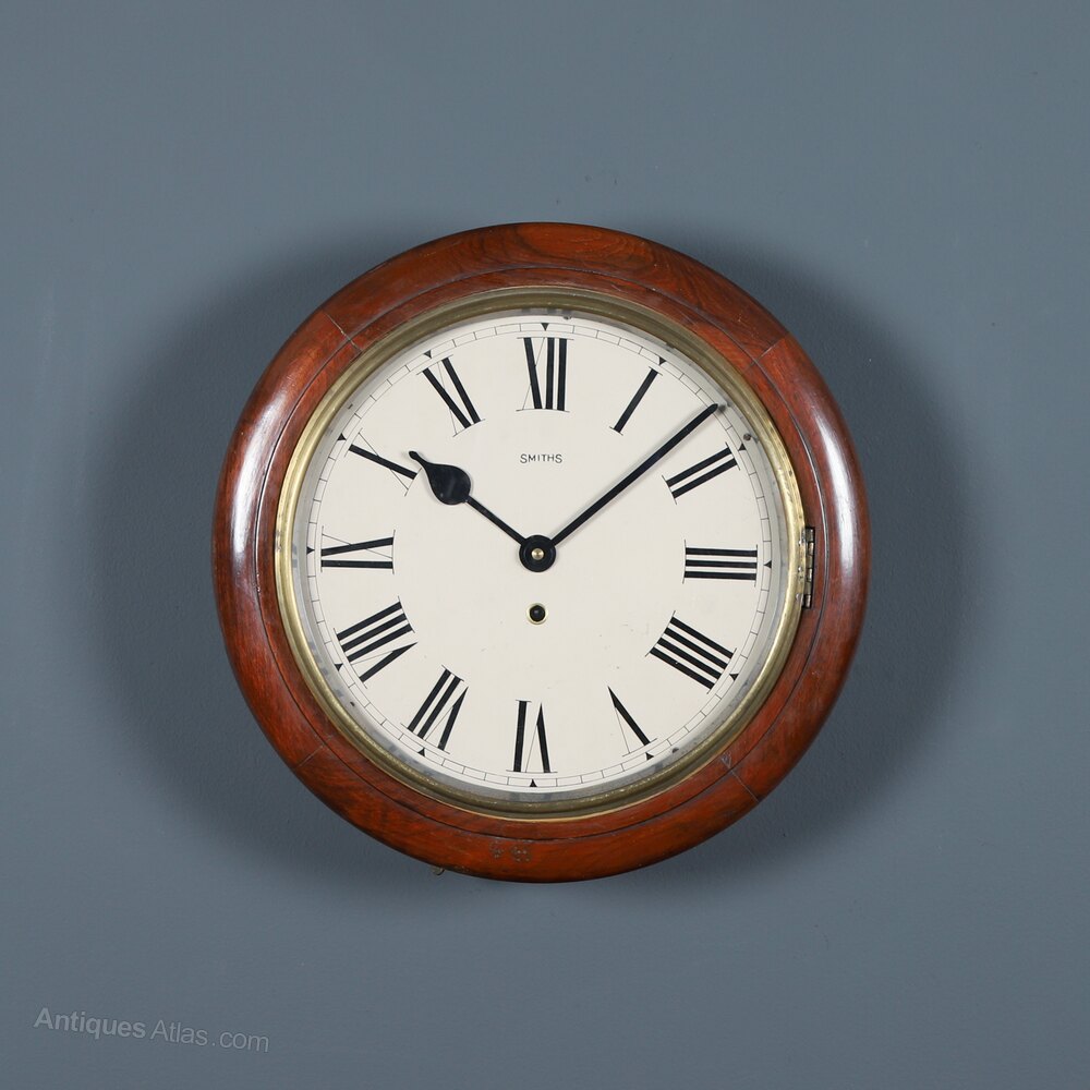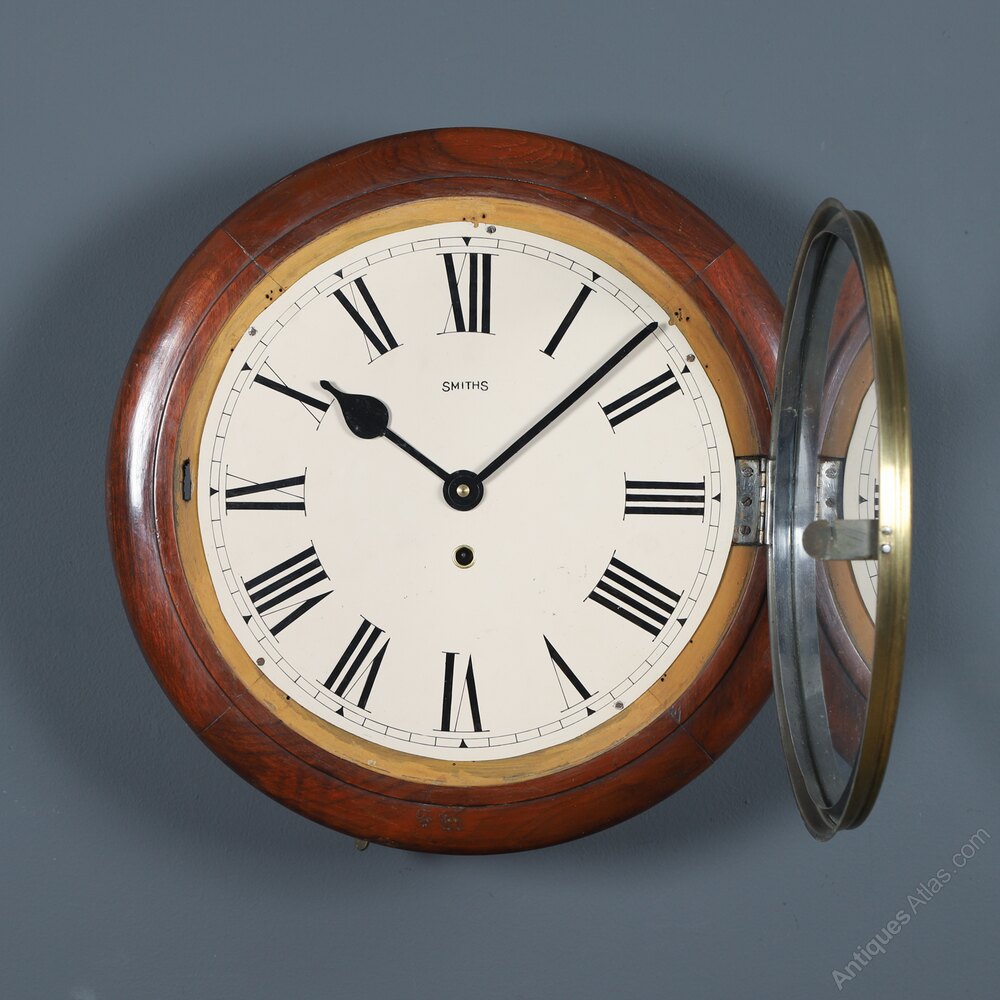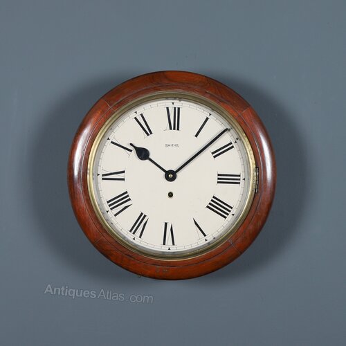 This is a good quality antique mahogany 15½” Smiths wall clock, with a railway station design, incorporating a Smiths timepiece mechanism, circa 1930, which has been lovingly restored to its former glory and is now in good working order.Summary: