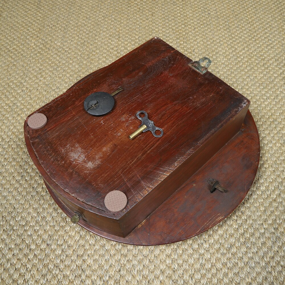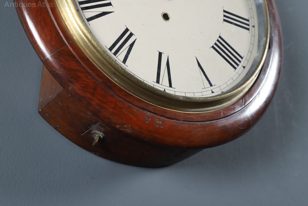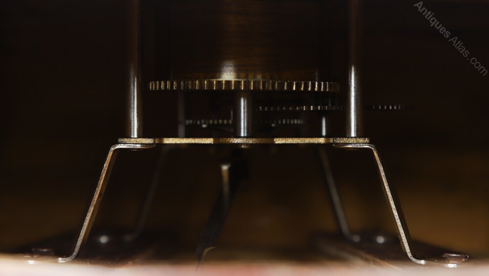 This mahogany wall clock boasts brass levelling lugs and pins, which are attached to each side of the clock and are designed to give the clock traction against the wall and allow the angle of the case to be adjusted away from the wall if the clock is hung on wall which is not vertically straight, such as in old buildings.