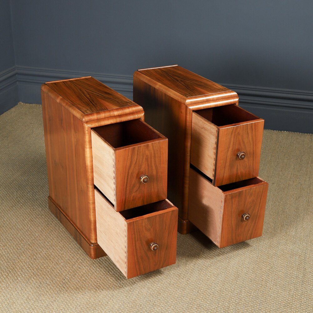 ConditionThis is a fine quality pair of antique English Art Deco bedside chests, constructed from decorative mirror-matched figured walnut, with two drawers, circa 1930, in excellent condition. They are pedestals from an Art Deco dressing table, which have been adapted into bedside chests. The Art Deco bedside tables have been cleaned and French polished by hand to a professional standard in our workshop, therefore the finish is in excellent condition. Nominal old use marks to the leading edges, sides and inside the drawer bottoms, but nothing significant considering the age of them. The drawers are well constructed, run freely and close flush to the frame and retain the original Bakelite knobs. These Art Deco cabinets are well constructed, solid in joint and ready to use.