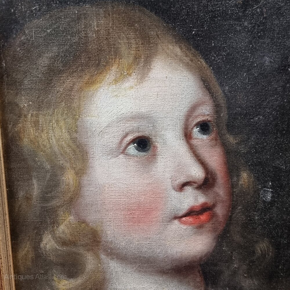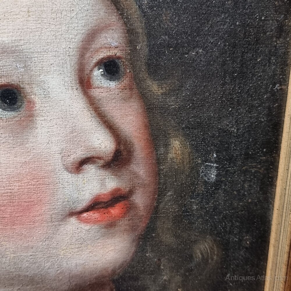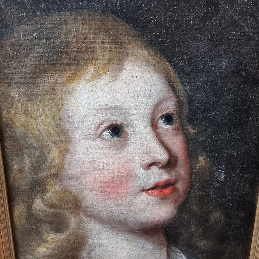 A 17th century portrait of a young boy, probably English school. This painting is a fragment of a much larger painting and the canvas has been laid on board. The painting itself is of fantastic quality and shows the boy with his head slightly turned and looking up. There is a small area to the right of the face, which looks like it may be a restoration.Measurements