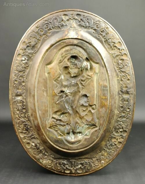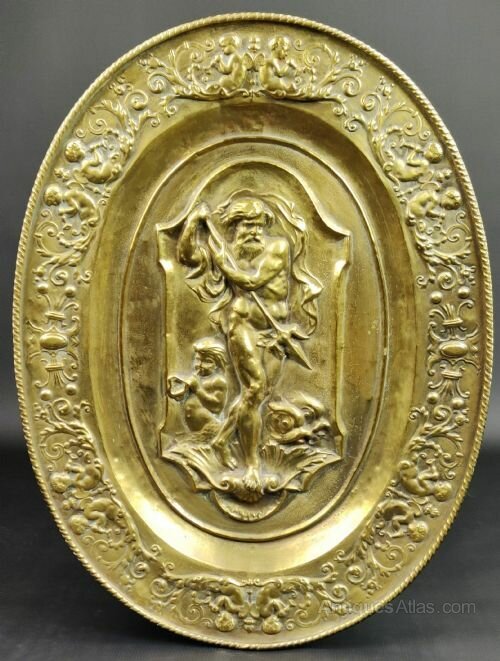 A decorative 19th century repoussé brass display plaque depicting Neptune.The plaque has a couple of tiny holes where it has been fixed to a wall at some stage but overall is in excellent condition.