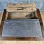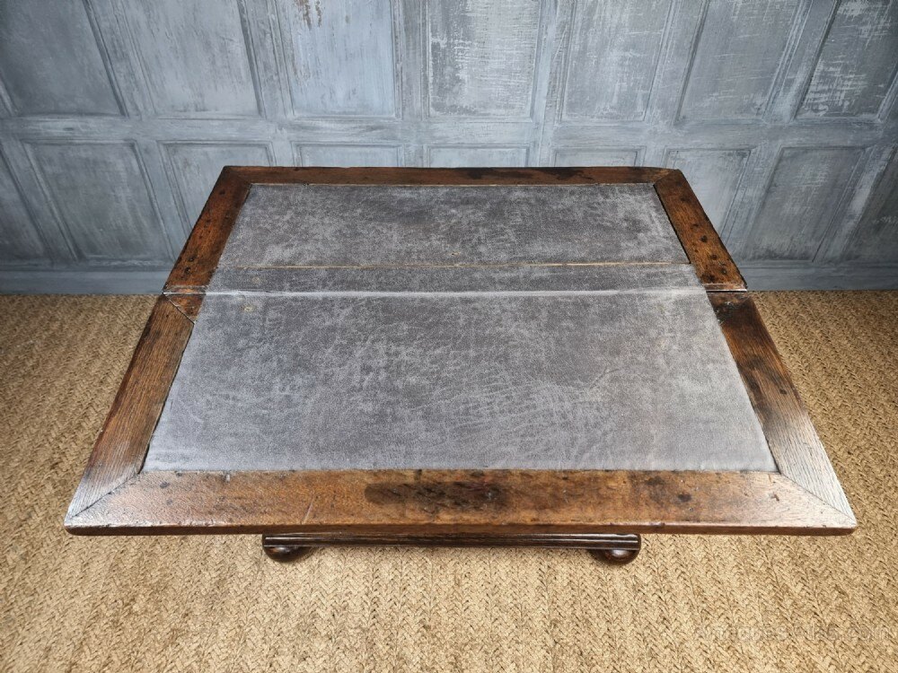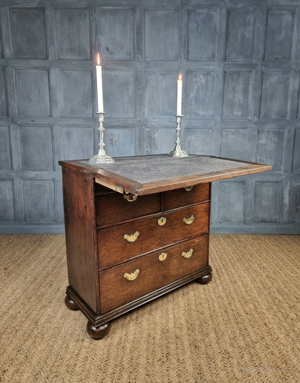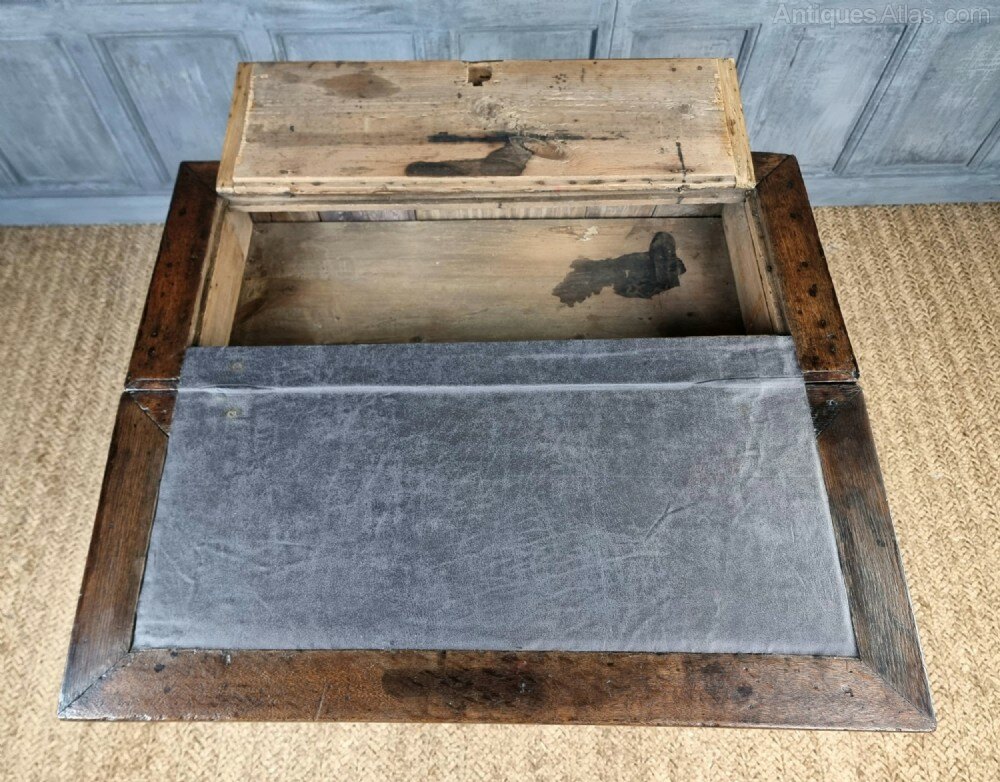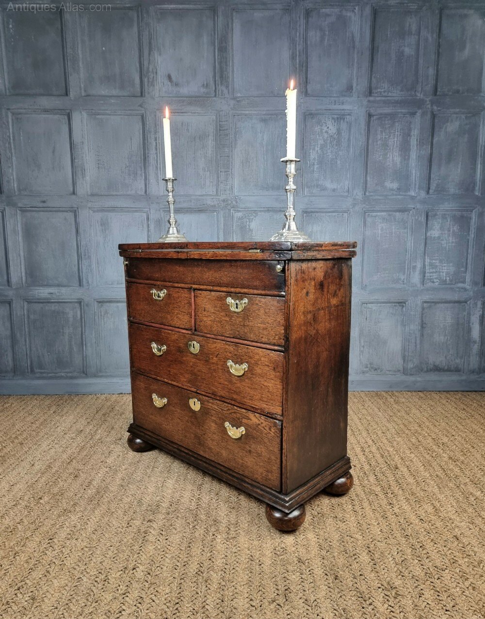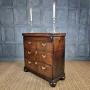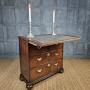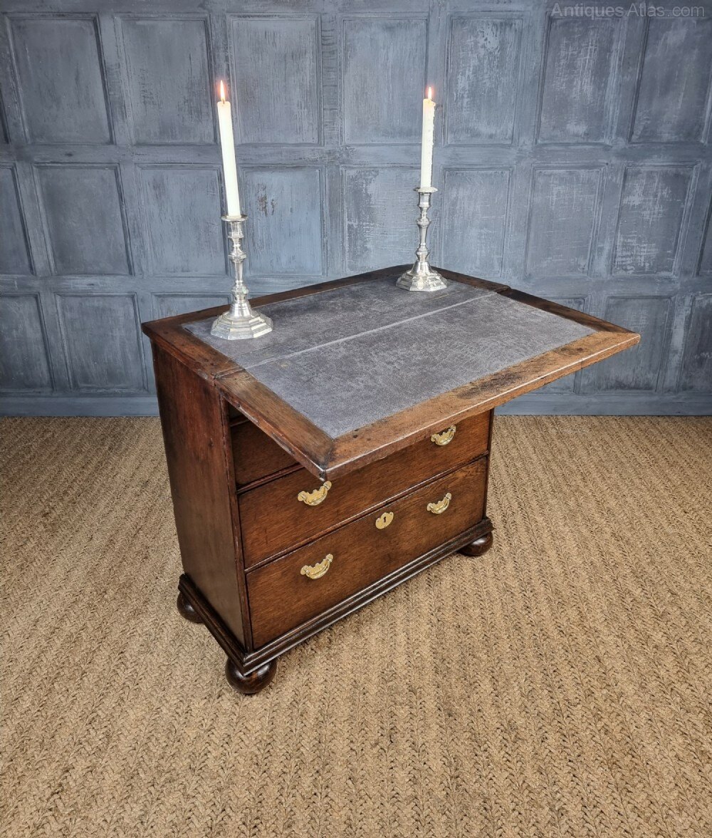 A small 18th century oak batchelors chest of tiny proportions. The chest consists of a two small over two long drawer configeration, the drawer hardware would of orignally had drop handles, though the current brassware is period and sits rather nicely against the oak. There are two ledges that pull out each side at the top of the chest, to which you then fold open the writing slope, which has an integral compartment for paperwork, stationary etc.The chest is missing a couple of locks from the drawers and the door to the compartment in the top is missing its lock also. There are some later restorations and some minor traces of very old wood worm.